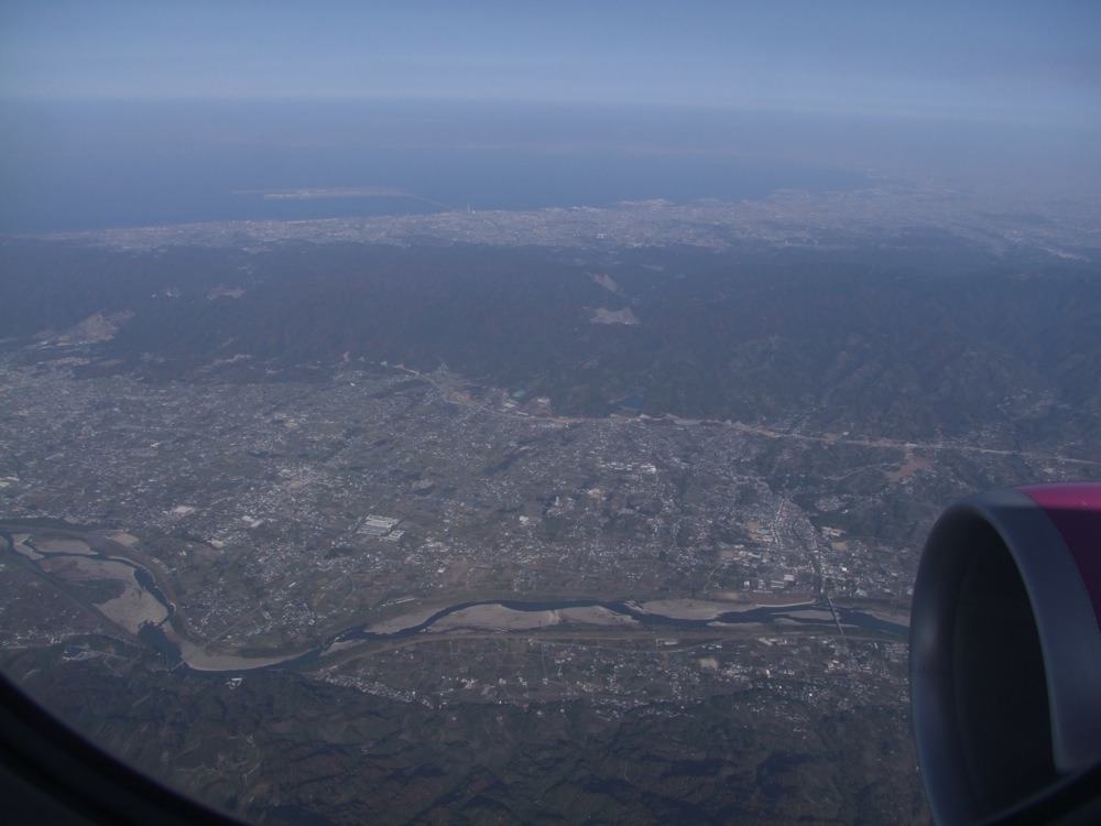 今回で2度目の搭乗となりましたが、やはり狭さは否めません…。足を組むのが少し難しいくらい…とでも言いましょうか。飛行機によっては最新式の座席になっていて、そちらは若干足下が広くなっているのですが、今回は以前のタイプでした。…とは言え、約1時間半程の所要時間なので、この値段なら文句を言っている場合ではないでしょう。折しも、この日はとても良い天気で、富士山は勿論の事、関西空港に到着する前に見える、奈良盆地(左下写真参照)や、和歌山県の紀ノ川付近(右下写真参照)等、飽きさせない機窓が続いていたものでした。