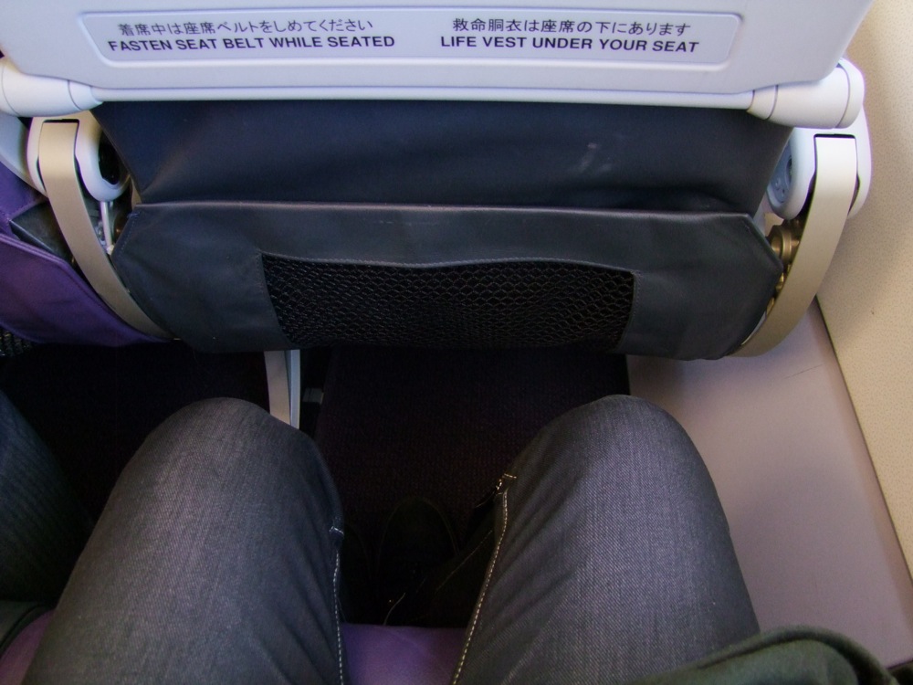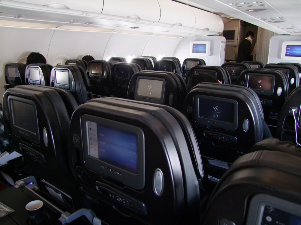 座ってみると、まあ広い事広い事…。先程が Peach だったので、比べるのが少し可哀想になるくらいですが、スターフライヤーでは通常の航空会社よりもシートピッチを広めに設定してあって、更にフットレストや個人用モニター等、エコノミーシートとしては国内で最も豪華な座席の1つに挙げられるかもしれません。こうなると先程とは逆で、この短い所要時間が惜しまれてしまうような気がしてしまうのですが(笑)、実際、機窓を見ていたり、モニターの番組を楽しんでいたりしていると、もう福岡空港に向けて高度を下げている状態でした。あんなに晴れていた天気が、福岡ではどうやら雨という天気で、たちまち雲中飛行になってしまいましたが、こちらはモニターがあるので退屈知らずなのです。