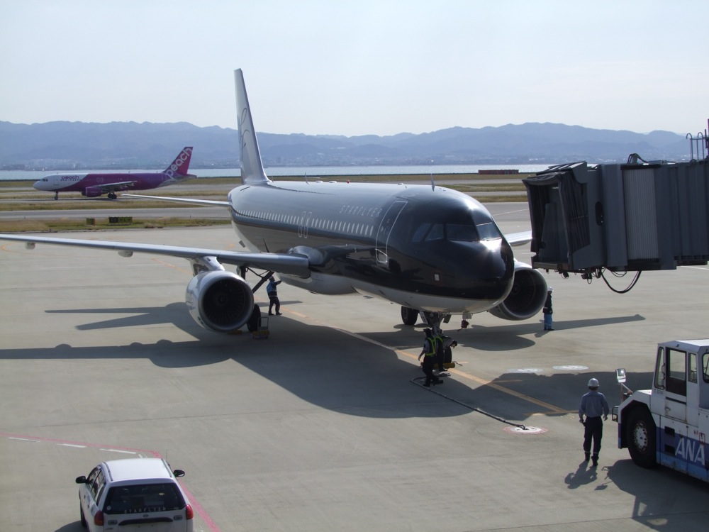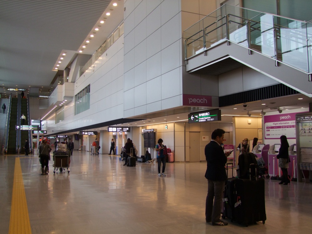 〔竹内大輔、北九州ツアー(2012.4.5〜4.11)〕の時に使った Peach という航空会社を覚えてますでしょうか。この時は就航したてで、まだ東京には就航していなかったのですが、最近、成田空港〜関西空港便が就航しまして、ついに東京(成田ですが)にも顔を出す事になったのでした。値段は、就航キャンペーンという事で、2980円という破格の値段が提示されていまして(タイミングさえ良ければ、もっと安い運賃もありました)、恐らく、今後ツアーを行う時にもお世話になる機会が増えてくると思うので、今のうちに乗っておく事は責務のような感じがしてしまいました(笑)。また、お気付きかもしれませんが、行き先が関西空港になっているので、ここでまた別の航空会社に乗り換え、そこから先はスターフライヤーで福岡空港に向かう事にしました。どちらも大手会社より安い値段を展開させている航空会社ですが、片や LCC、片や高品質と、その戦略は全く異なるものです。その2社を乗り比べてみるのも面白いかもしれません。Peach は成田空港の第1ターミナルの1階にチェックインカウンターを設けてあり、例によって早起きを敢行し、いざ関西空港へと(笑)向かったのでした。