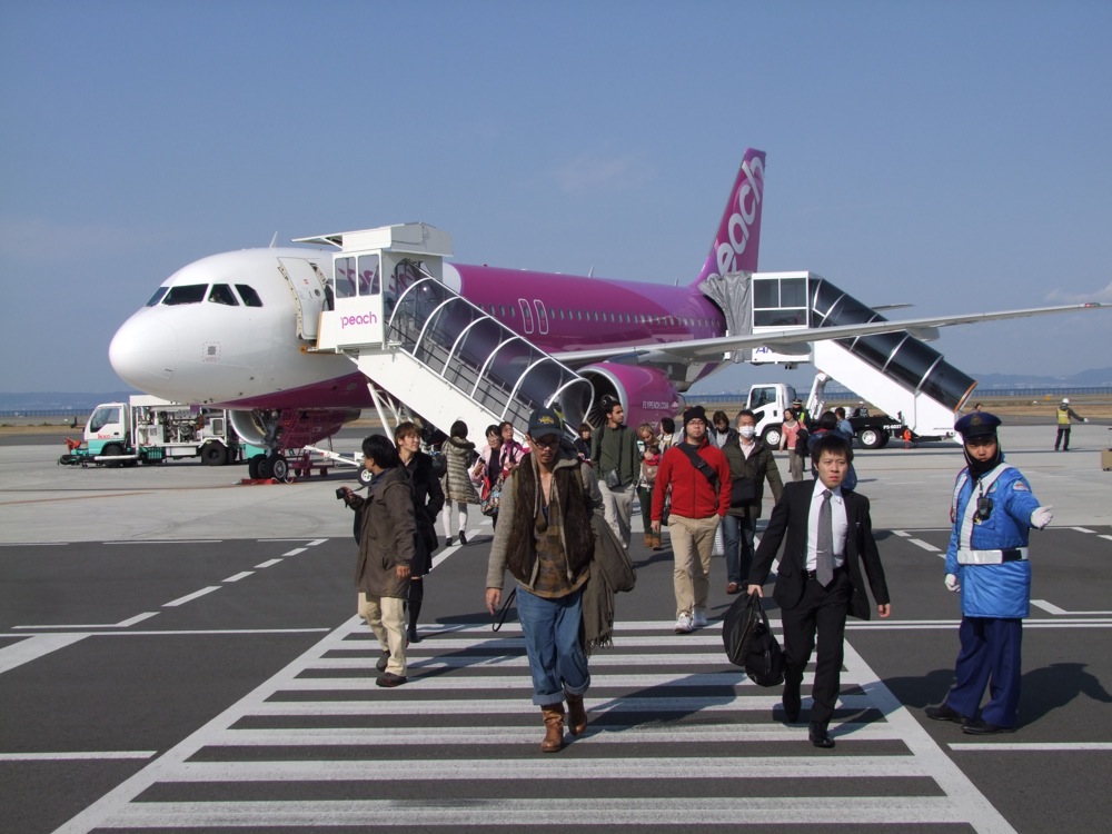 こうして、関西空港に定刻に到着しました。以前、ここに来た時は、まだターミナルというものが無いような状態だったのですが、ついに関西空港には Peach 専用と言えるターミナルが出来まして、これは国内初の LCC 専用ターミナルでもあるそうです。ここを発着する Peach の飛行機はボーディング・ブリッジを使わず、タラップのみ。しかし前後に2つ取り付けて旅客の乗降をスムーズにし、定刻を維持しようとしています。また、トーイングカーも使わず、飛行機は出発時、最初から自走で滑走路に向かう等、徹底したコスト削減化が図られているのです。
