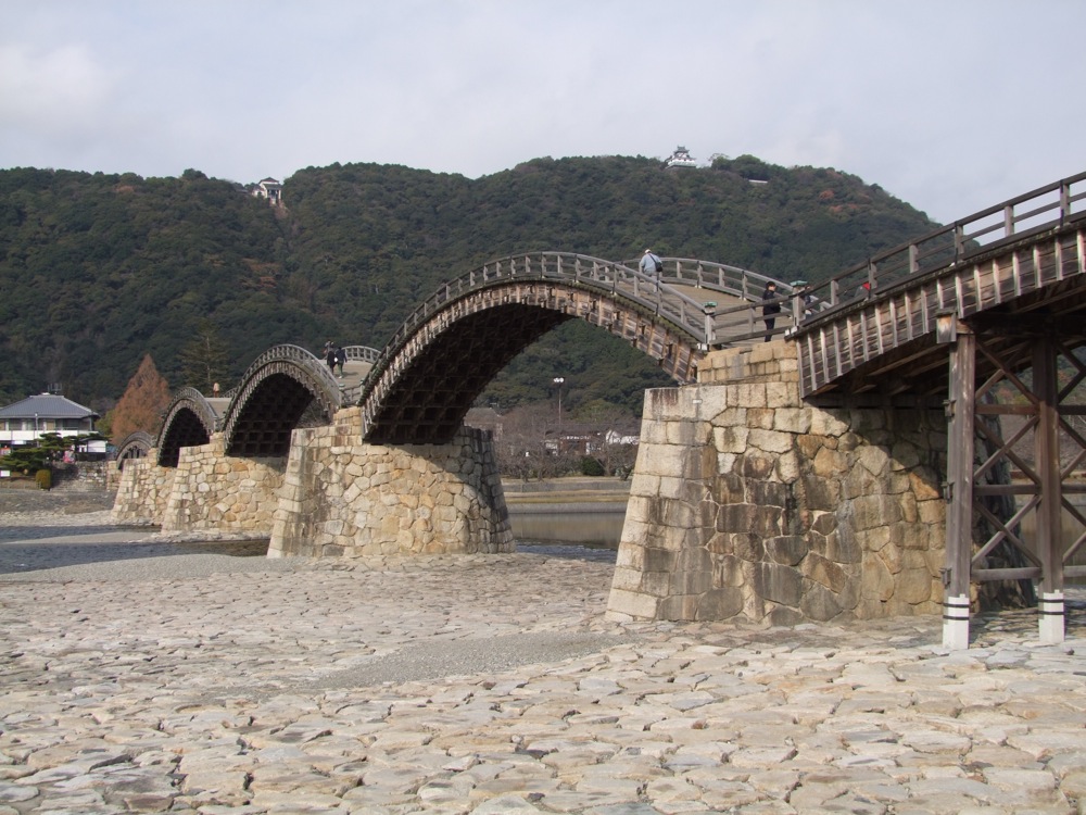 これです。もう、本等に載っている写真で見たままではありませんか(笑)。5連のアーチは美しく、周囲の雰囲気とも相まって、日本三大橋に数えられているのも納得です。一応、対岸まで往復もしてきました。…実はこの錦帯橋、自分が中学生の頃に、学校の課題か何かの挿絵で描いた事があり、その時に錦帯橋と分かっていたどうかは不明ですが、変に思い入れのある橋でもあったのでした。絵の構図的に、ここから見た景色だったのかとか、当時に想いを馳せながら、良い時間を過ごせたような気がしました。