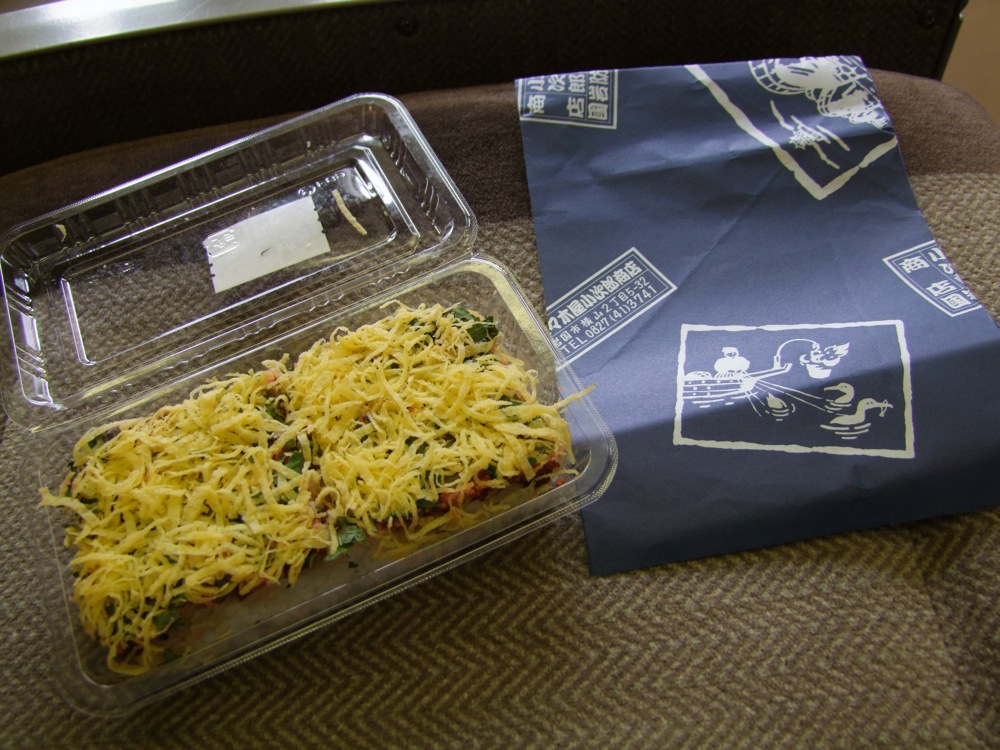 …さて、岩国駅へ戻り、電車で広島方面へと向かいます。その前に、腹ごしらえもしておかなくてはなりません。旅のお供は、岩国名物という岩国寿司(右下写真参照)。サンドイッチ状の押し寿司とでも言いましょうか。車内用に購入したので、それは小規模なものでしたが、十分に満足出来る代物でございました♪