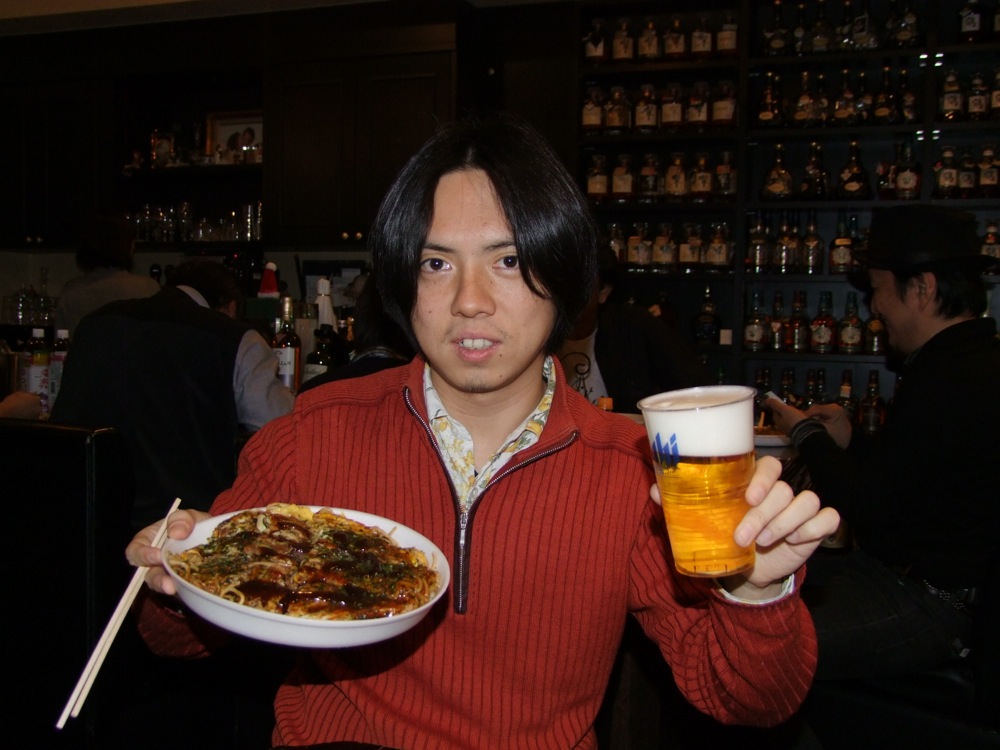 既にお店には丸本さんがいらっしゃっていて、色々とセッティングを行っていました。ここはライブハウスではないので、音響云々等は、全て自分達でやり繰りしなければならなく、お友達の方に手伝って貰っていて、相談しながら音を作っていっている感じでした。わりと広めなお店でしたが、今日は丸本さんの親戚一同も含め、ほぼ満席が予定されているそうで、こちらとしても気合いが入ります。丸本さんも、久々に会う友人の方と沢山話しをされてて、緊張の様子を見せつつも、目がキラキラしていたような印象でした。恐らく、誰よりもこの日を楽しみにしていたのではないでしょうか。自分もお好み焼きとビールを早速頂きつつ(笑)、本番により良い形で臨む事にしました!