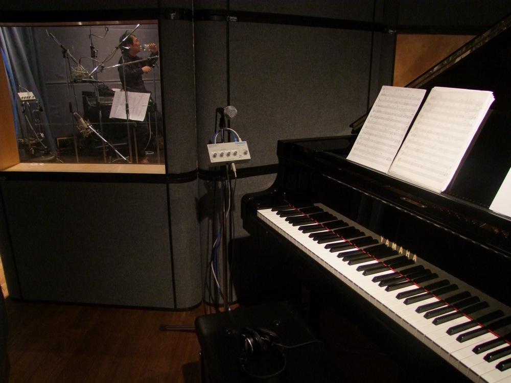 そもそも、この直前のライブが日を跨いでいるわけですから、スタジオに自分が24:00に着くわけがなく、移動の電車も遅れていて、自分が着けたのは深夜1:00を回った辺りでした。まあ、基本は最初の1時間は、マイクやサウンド・チェックに使うので、そんなに問題があったわけではありませんが、自分はスタジオに着いてすぐにピアノに座り、颯爽と録音に移った…という感じでした(笑)。しかし、かえってそれが集中力を引き出させていたような気もしてます。