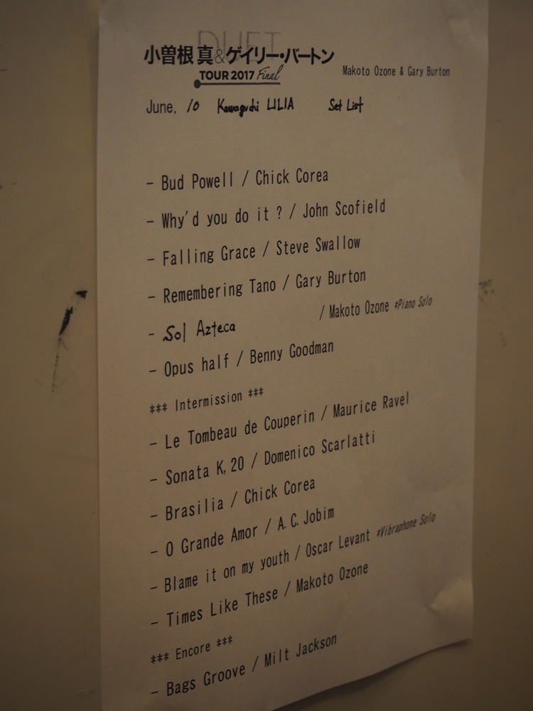 そして、本編が終わってアンコール、更にはダブルアンコールもお応えてしてくれ、この日の演奏は全て終了となりました。鳴り止まない拍手、観客の総立ち…。この瞬間を自分も共有出来た事に幸せを感じられた時間でした。終始とても温かい時間で、何より、こんなに師弟愛に満ちたライブを見たのは初めてでした…。より一層、自分も音楽活動に励みたいと思った次第です。上写真は、公開されたこの日のセットリスト。ジャンルを問わない幅広い選曲と共に、個人的にも馴染みのある曲が多くて嬉しかったです。