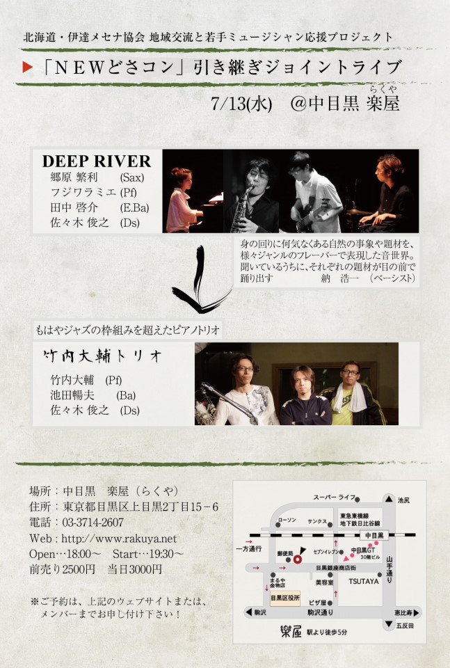 先日、今度13日(水)に行われるライブの為のリハーサルを行ってきました。お相手は自分のピアノトリオのメンバー…ではなく、対バンする相手である、サックスの郷原君がリーダーを務める Deep River とです。13日のライブは、何度も言っているように、北海道の伊達で行われるイベントに参加するバンドの“引き継ぎ”というライブ…という意味合いが込められていて、やはりただの対バンライブにはしたくないという思いもあるので、“ジョイント・ライブ”とあるように、本当に2つのバンドを組み合わせた演奏もやっておきたかったのです。…勿論、自分が Deep River のメンバーと一緒に演奏するのは初めてなので(個々では沢山ありますが…)、色々練りたい部分も出てきたのは当然で、リハーサルも入念に行われました。
