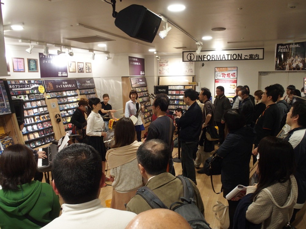 本番は17:00から時間通り始まりました。日曜日という事もあり、最も良い時間だったようにも思います。客席は特に座席が用意されるわけでもなく、本当に売り場のスペースを利用して立ち見で御覧になって頂くしかないのですが、人は多く、その集まりはCDが陳列されている棚と棚との間にまで及んでいました。そこに響き渡るのは、奄美民謡アレンジの“豊年節”…。そして津軽三味線の力強いソロもお届けさせます。
