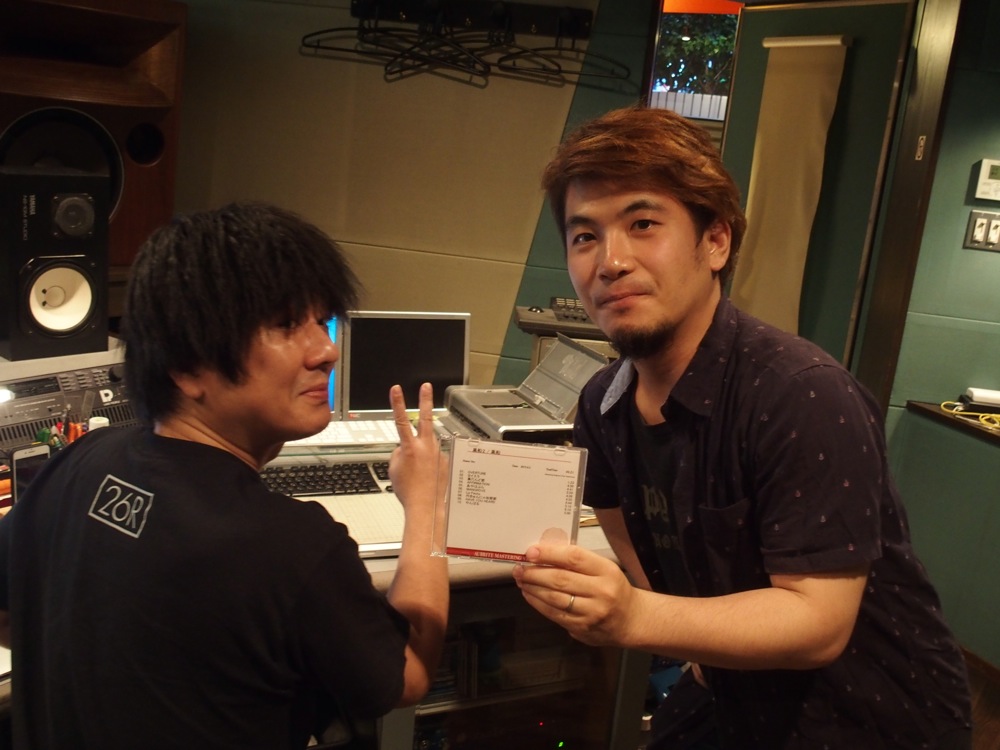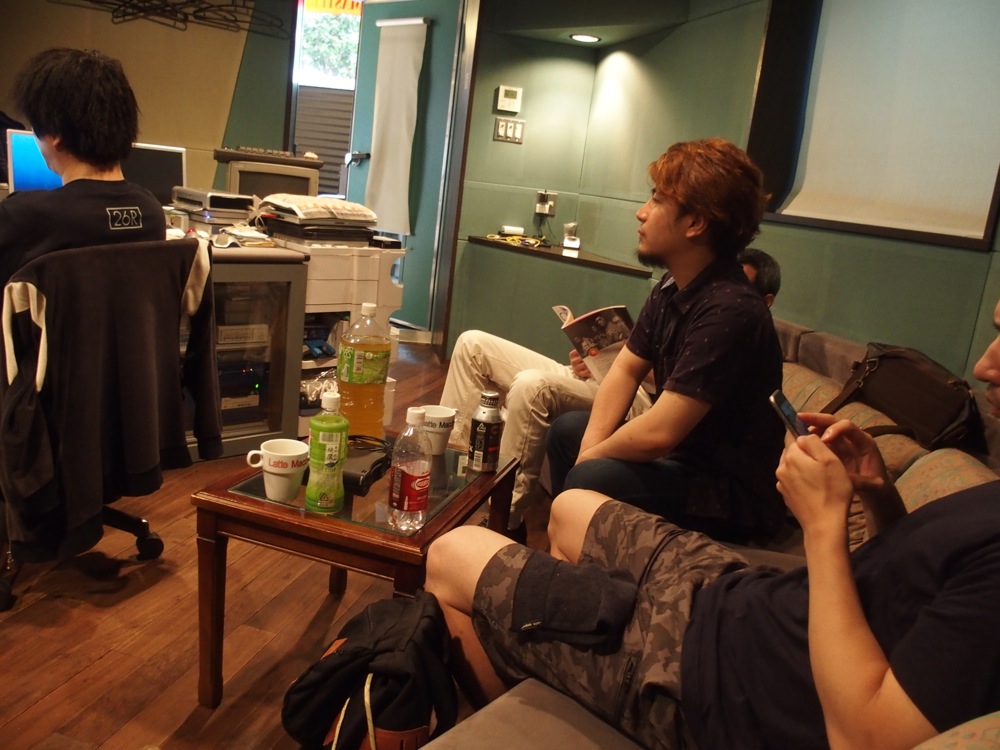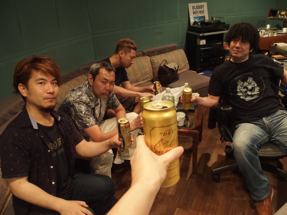 より格好良くなったサウンドを聴きながら、作業を進めていきます。…とは言え、サウンドの方向性を一度決めてしまえば後は順調で、曲間を調整しながら、いつしか最後の曲に辿り着く事が出来ました!…そして最終作業として、作品の最初から最後まで、皆でこれらの音源に耳を傾けていきます。勿論、曲間に違和感が無いかを確かめる時間でもあるわけですが、リラックスして聴くのも大事という事で、ひと足早く祝杯を上げて聴く事にしました(右上写真参照…笑)。感無量の時間でもありますよね♪