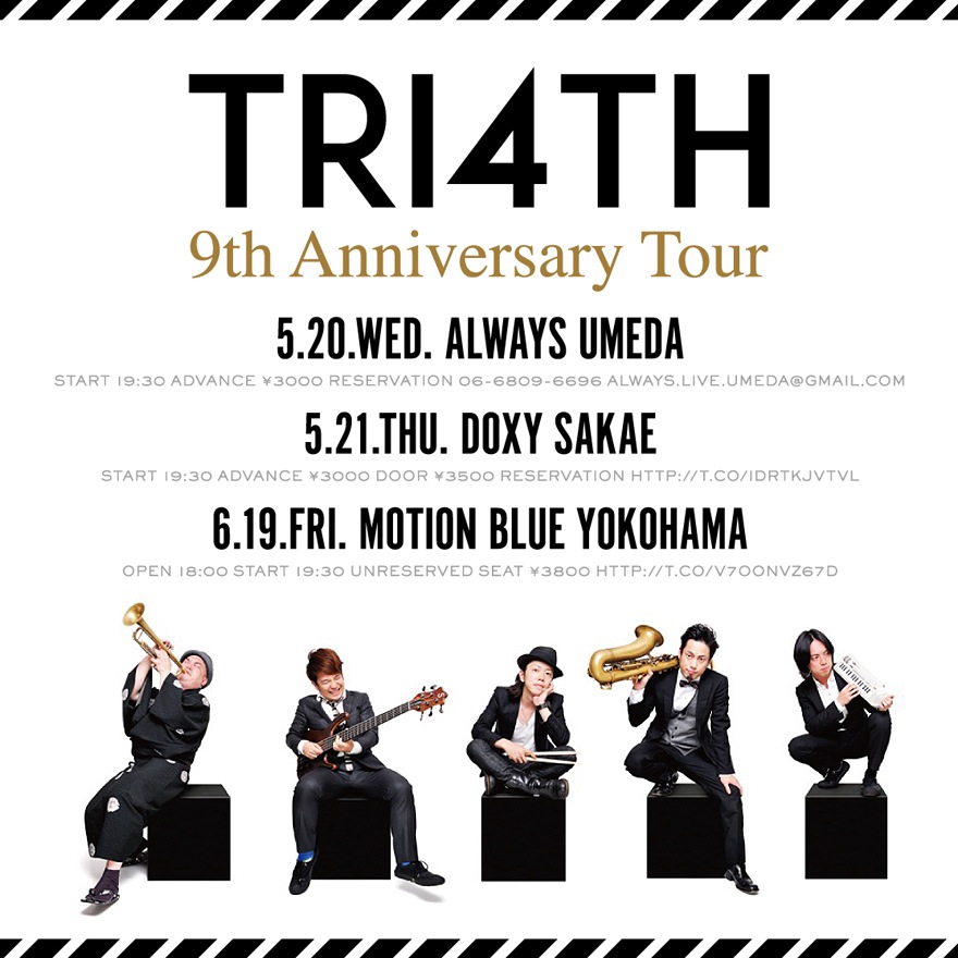 そんな 3rd.CDアルバムをリリースしてから現在に至り、この期間中も色々な場所でライブをやらせて頂きました。2年目、3年目にもなれば流石にライブやツアーにも慣れ、昔から自分がいたかのようにメンバーも接してくれているので、楽しくやらせて頂いています。そして今年は結成9周年。自分が TRI4TH と接してからの期間が3〜4年だとすると、まだ自分が加入する前の期間の方が長い、息の長いバンドの1つのように認識されてくる頃でしょう。メンバーの年齢も30代半ばになり(笑)、いつまでも若手とは言ってられません。メンバーそれぞれの集大成を是非とも見に来て頂きたいものです。改めて、6月19日(金)ライブの詳細です。