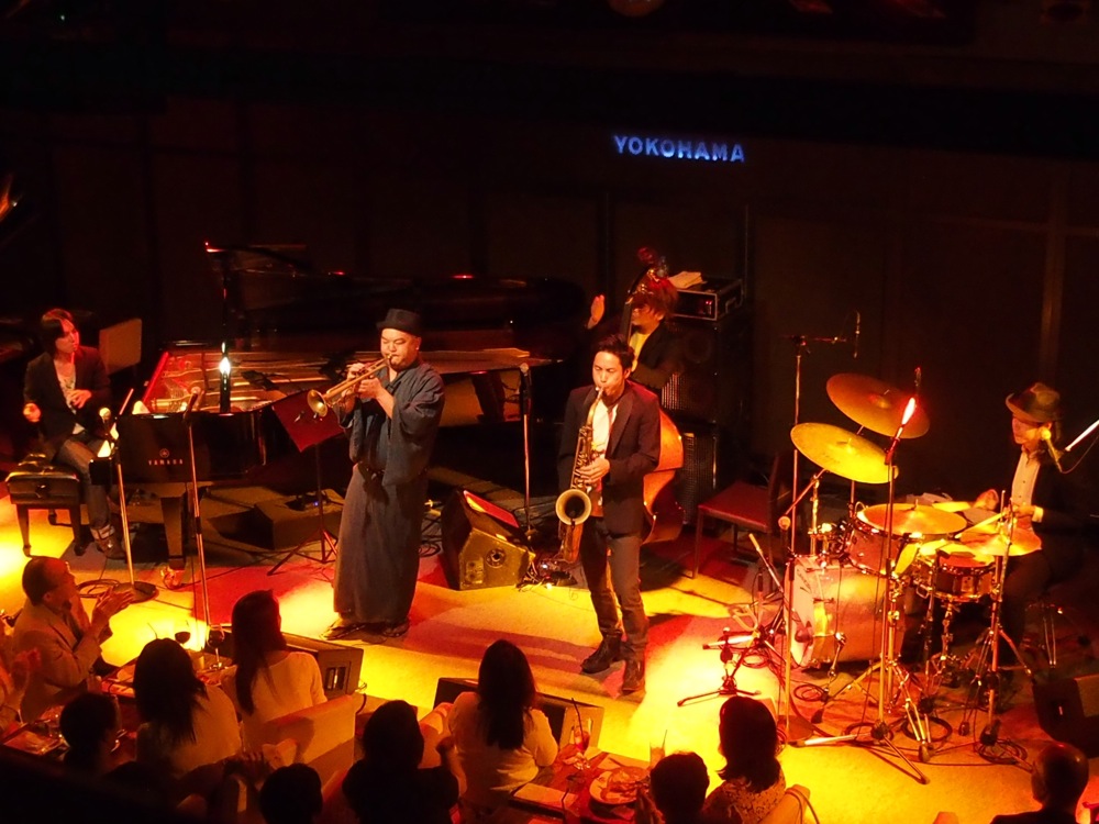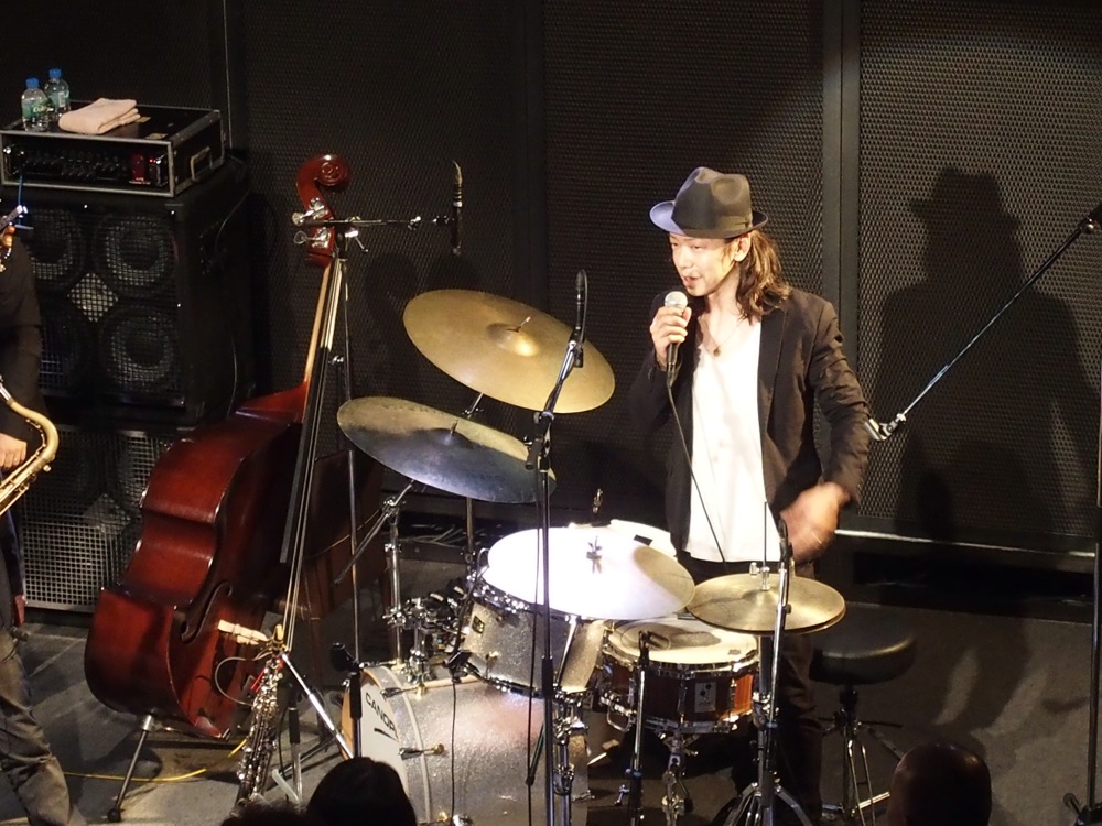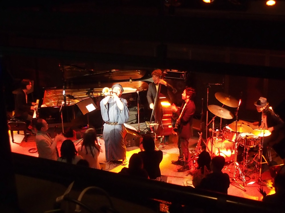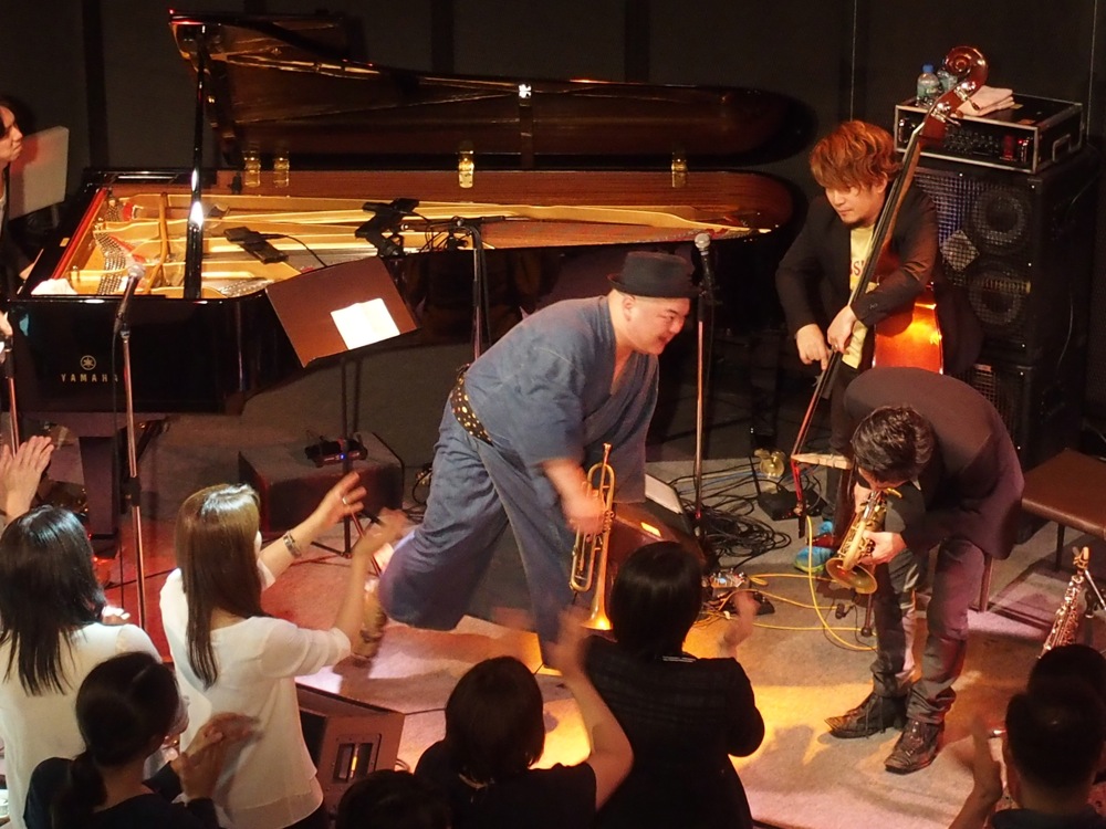 織田君がデュオ編成なら、サックスの藤田君も負けじと?デュオ編成で披露します。こちらはお馴染みの“Circle”で、今回のツアーで大阪、名古屋とも取り上げてきた曲でもあります。…そしてバラードでしっとりと聴かせた後には、お客さんを立たせて、いつものように演奏しながら客席に乱入していく藤田君の姿が…(笑)。この色々な側面が、TRI4TH というバンド自体の魅力にも繋がっていっているような気がします。