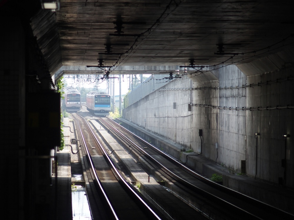 地下駅は次の陸前原ノ町駅までで、この駅からは路線が地上に出ていく様(左下写真参照)が見て取れます。地上に出た直前に潜る路線は、東北本線の貨物線(この路線は仙台駅を通らず、仙台駅の南北を短絡して結んでいます)です。そして地上に出ると高架になり、カーブ上に存在する苦竹駅(右下写真参照)となります。