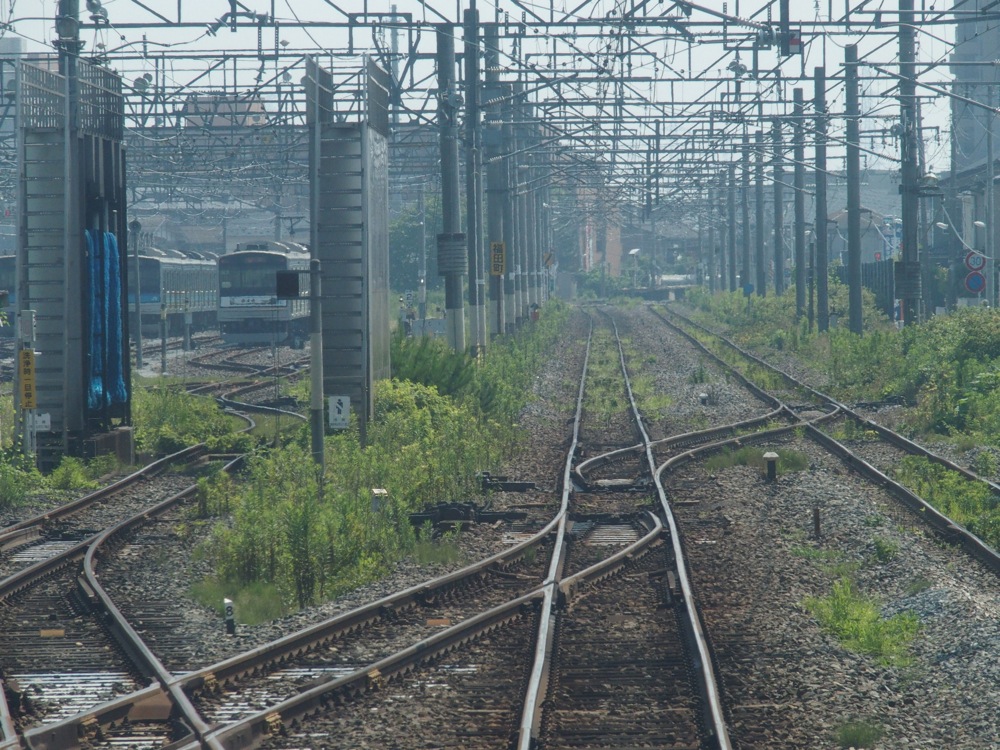 そんな松島の最寄り駅は、仙石線だけに存在する松島海岸駅となります。近くに東北本線の線路もありますが、この辺りに駅はなく、ここから1kmほど先に行ったところに松島駅は存在していますが、観光地への足としては少々不便かもしれませんし、JRとしても、松島観光へは仙石線の松島海岸駅を促しています。この付近、東北本線と仙石線は並走はしているものの、乗り換え出来る駅は今まで無く、通しの乗車券も発行されていませんでした…。そこで開業したのが、松島海岸駅と次の高城町駅間で、両線の線路が一番近付くポイント(左下写真参照…真ん中が仙石線の線路で、奥が東北本線)に設けられた渡り線(右下写真参照…左から右に伸びているのが渡り線)を利用した、仙石東北ラインです。渡り線自体は以前から設けられていましたが、仙石東北ライン開業の為に改良して作られました。