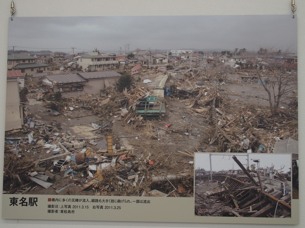 旧野蒜駅のホームから内陸側を見ると、かなり遠くの高台に列車が走っているのが目に入っていきました。これが新しいルートの野蒜駅で、旧市街からも結構離れてしまいましたが、これからは新しい駅周辺の開発が進むのでしょうか…。旧野蒜駅の周りも、以前は建物も沢山あったような記憶がしたのですが、今では数えるぐらいしか建物が残っていません。…とは言え、旧野蒜駅舎は改修され、観光交流拠点「野蒜地域交流センター」として生まれ変わりました。1階部分がファミリーマート、2階部分は多目的スペースとして、人を集める場所として今後注目されていく事でしょう。建物内には震災直後の様子が写真で掲示されており、先程通った東名駅の当時の様子も、リアルに目にする事が出来ました(右下写真参照)。