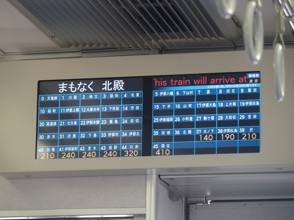 今回乗った飯田線の列車はワンマン列車で、運転席上部には御丁寧に料金表が書いてありましたが、飯田駅のだいぶ先な事…(笑)。飯田線に乗るのは今回2回目で、しかも1回目の時は夜行列車からの早朝時間だったので、半分以上は寝て過ごし、記憶があまり鮮明では無かったのでした。…なので、今回は景色や雰囲気を目に焼き付けておこうと思います。…そうなると、そもそもの今回の目的が変わってきてしまうのですが(笑)、もはや細かい事を考えるのは辞めておきましょう。まだまだ時間は掛かるのですから…。
