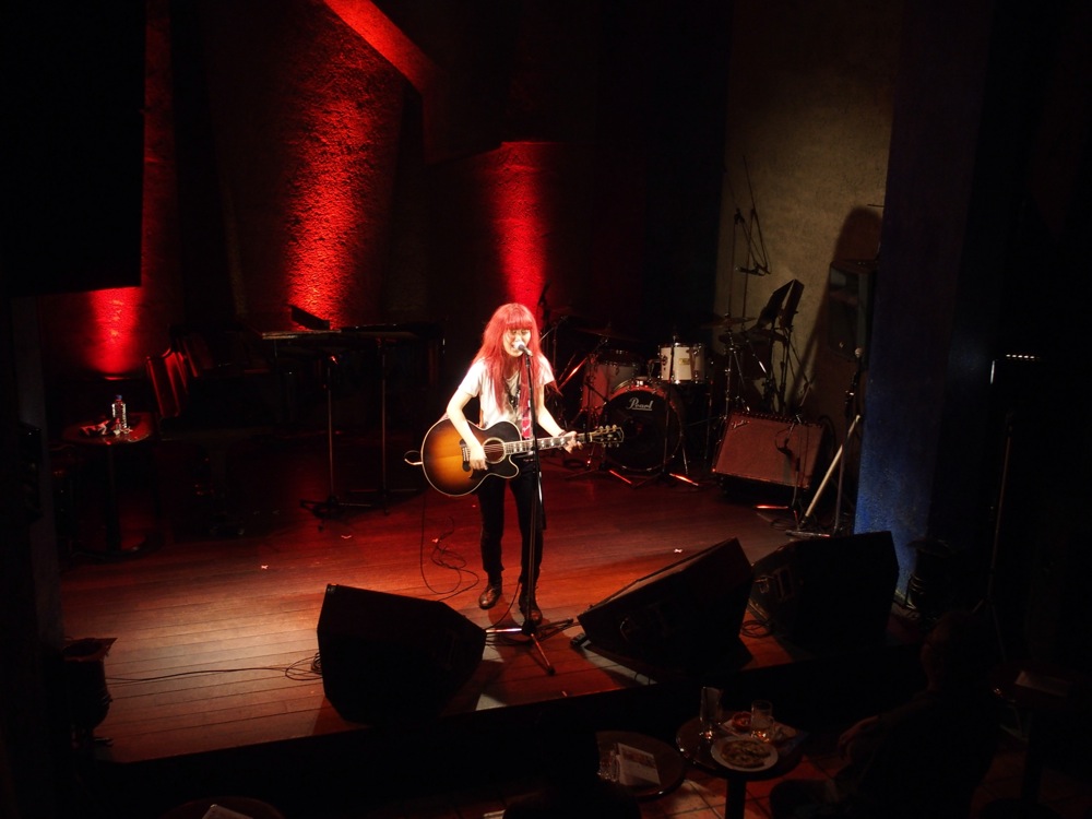 この日は対バン形式となっていて、自分達はトリの4バンド目となっていたので、自分達の前に出演されていた個性的な出演者達をゆっくりと見る事が出来ました。それらの1バンド目から飛ばしていたのが、スーパー高校生と言われる、美里ウィンチェスターさん(右上写真参照)。鮮やかな赤い髪こそ印象的なものの、ギターの腕前はかなりのもので、激しい演奏や動きと共に繰り出される楽曲は正にロックでした。
