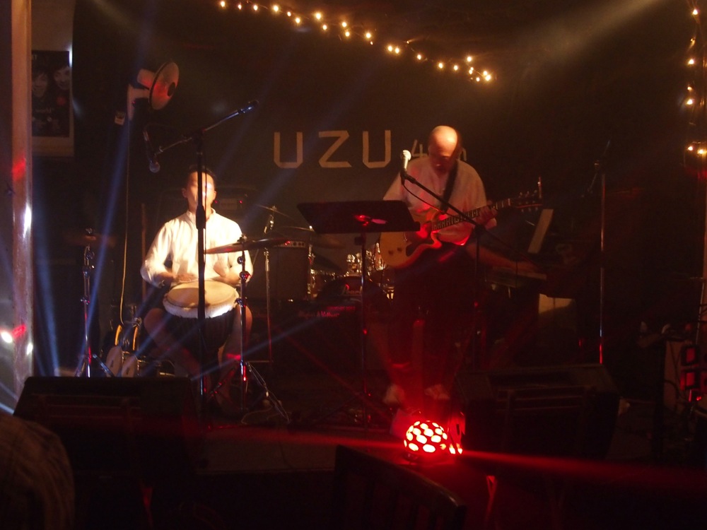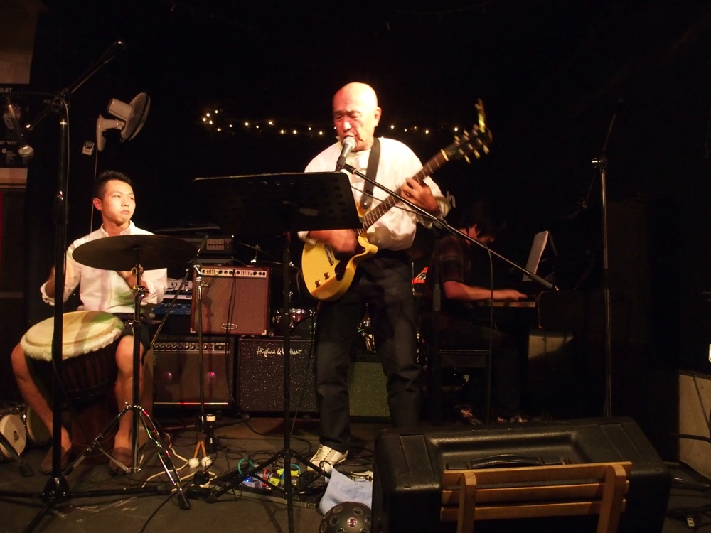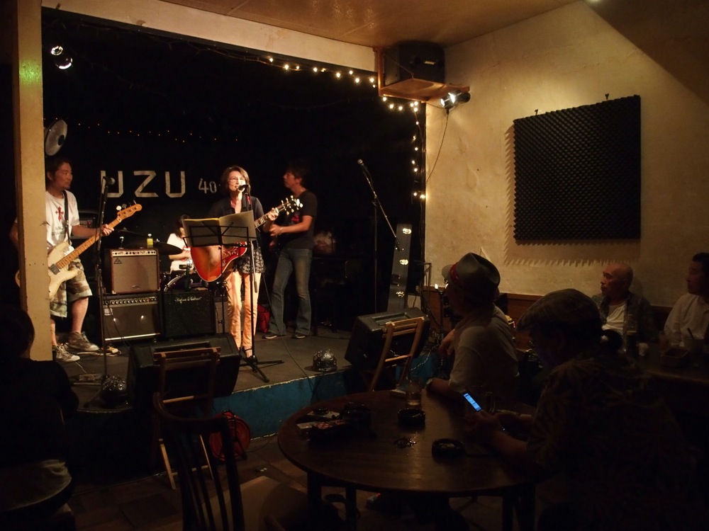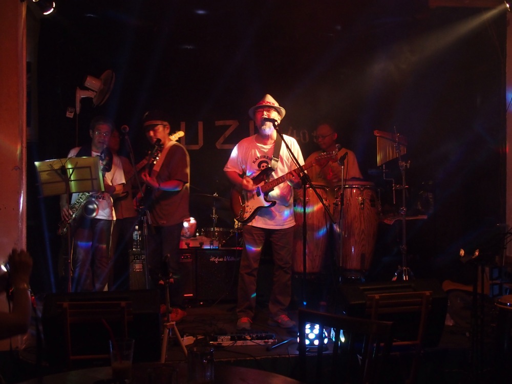 9年振りに Uzu に訪れた為か、ステージ上にちょっとした変化がありまして、照明が増えていたのと、何とスモークを焚けるようになっていました(笑)。これが結構な威力で、それぞれのソロを回している時に焚かれていたのですが、そんなに広いステージでは無いので、たちまち目の前の視界が薄くなり、不思議な環境が出来上がりました。しかしその時には照明の綺麗な光の筋道が見えたりしたので、これはこれで良かったのかもしれません。伊藤さんが歌うからこそ面白い“ギリギリなんだぜ”(笑)の次に、強引にアンコール曲“人生色々下心”をお送りして、無事に終了となりました!…久し振りのライブでしたが、大いに盛り上がったと思います。