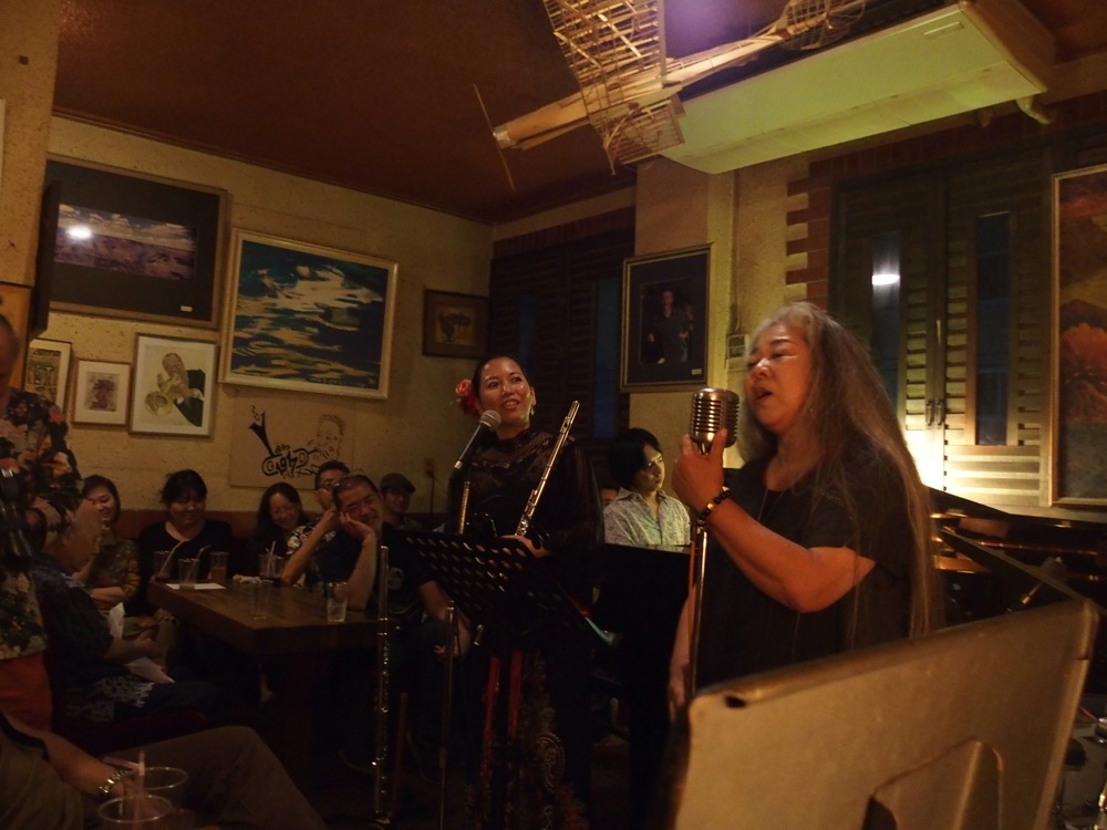 また、今回のCDが全編デュオという事もあって、ライブも西仲さんと自分の2人だけでお送りしていったのですが、途中には唄うたいの古謝美佐子さんを突然ステージにお呼びしたりと、ステージの変化も付けられたと思います。ライブは20:00を少し過ぎた辺りから始め、予定通りの2ステージをやるも、気付いたら23:30頃になっていました(笑)!…流石は沖縄です。久し振りで時間の感覚を忘れていましたが、お客さんの殆どもこの時間で帰らずでした。そうです、これが沖縄でした!