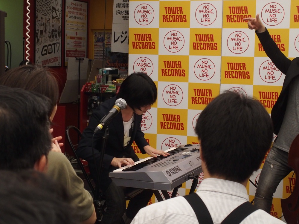 本当にタワーレコード渋谷店の1階が、沢山のお客さんで埋め尽くされていました。1階の大きな入口の外はどうなっていたのでしょうか。そこまで人が一杯だったように思います。また、1階という場所柄、たまたま足を止めて頂いた方も多かった事でしょう。今回は色々な人に見て頂けるというのが第1の目的でもあり、この状況は嬉しかったですね。そして、更にテンションを上げて演奏していきました。もうだいぶ浸透してきているのか、“Freeway”の16連射ピアノイントロで歓声が起きたのには驚きました(笑)。