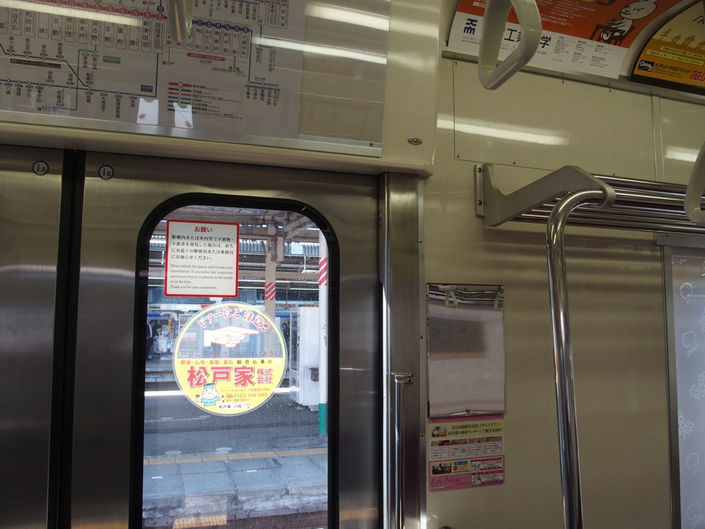 新京成の車内装備として特徴的なのが、ドア横に設けられた鏡です(上写真参照)。日本の他鉄道事業者では名古屋市営地下鉄や、相模鉄道(最近の車両は未装備)に見られる程度なので、結構珍しいと思います。前述のように、2014年に新コーポレートカラーが発表され、全車にその新塗装が施されるという事で、現在は旧塗装と新塗装車両が両方が見られるという過渡期の状況になっていますが(左下写真参照…両方ともN800形車両です)、鏡はしっかりと残っていますので(笑)、今後も新京成の特徴として生き続けていく事でしょう。