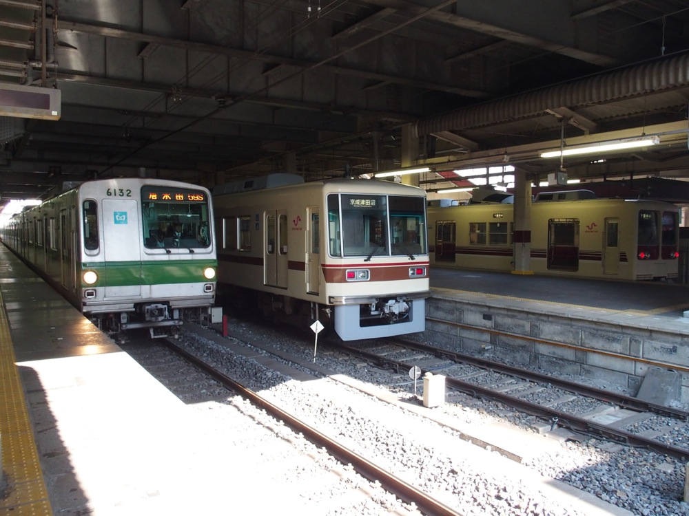 新津田沼駅を出ると、大きく逆S字を描きながら、JR総武本線を越え、そして京成本線へと合流し、終点の京成津田沼駅となります。新京成のホームは1面2線ですが、端の1線は車止めが設置されているものの、もう1線は京成千葉線の線路へと繋がっており、日中を中心に、2本に1本は京成千葉線の千葉中央駅まで片乗り入れが行われています。
