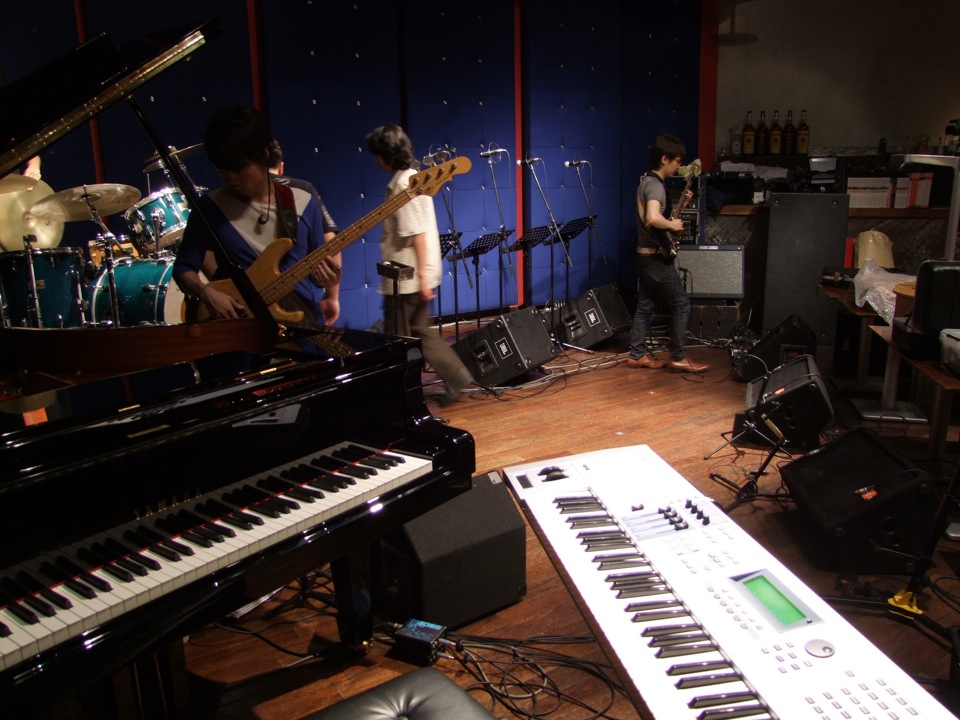 あっという間に1曲が終わり、ここからはブラス隊抜きのいつものメンバーで、“Hangover”へとなだれ込みます。自分もグランドピアノからキーボードへと移り、GG のサウンドでは欠かせないエレピを弾き始めます。これは割りと最近の曲ですが、それでも初めて演奏してからもう2年は経っており、月日の流れの早さを感じてしまいます。これは、活動している年数の割りには新曲が少ないせいかもしれませんが(笑)、それならば…と、この次には新曲“Too Much Rest”という曲を持ってきました。これはドラマーの立山秋航が書いたものですが、これまた何と皮肉めいたタイトルでしょう(笑)。恐らく、そんな彼の強い思いがこの曲に詰められている筈です。曲は8分の6拍子と、GG では今まで無かった曲調となっていて、確かに色々な信念が渦巻いてそうな雰囲気でもありました。こちらはアレンジ云々ではなく、確実に新鮮さ抜群の曲です。また新たな GG サンドを表現出来たのではないかと思います。