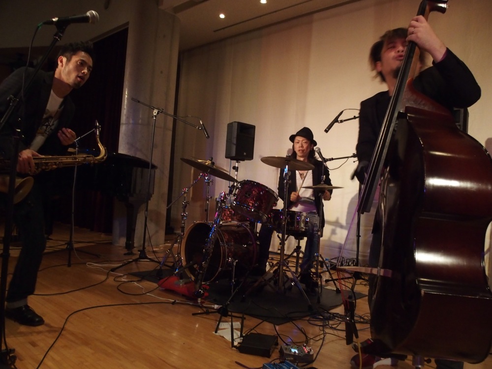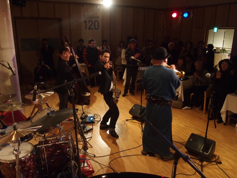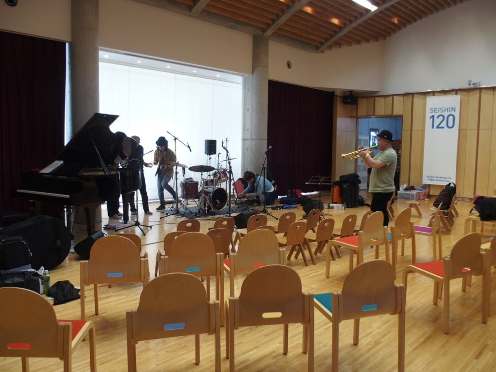 さて、まずはお昼の部の始まりです。“わらべ Jazz”の曲目を中心としたセットを組んで臨んだこのステージは、お客さんの対象も、お子様連れの家族が中心です。客席の前方部分には可愛い椅子が並べてありましたが、これは幼稚園内ならではでしょう。ここの園児も多かったに違いありません。ただ、後から考えると、むしろこの日1日は、ずっとこのような雰囲気なんだろうなとも思っていたものでした。それが夜になると、また雰囲気を変えたライブステージへと変貌を遂げるのです。