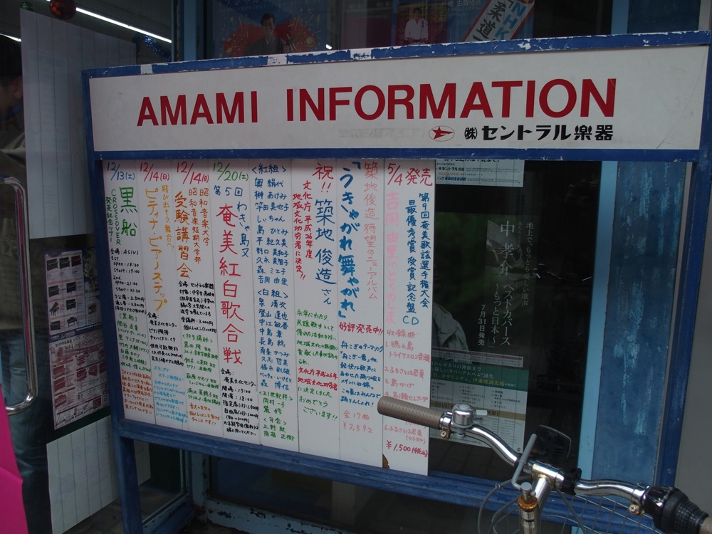 この事は、後から集合したメンバーにもすぐに伝えられ、関谷君は早速、奄美のコンビニであるワンツースリーマートにて追加の新聞を購入していたのでした。そして、この後には名瀬にある楽器屋、セントラル楽器にも御挨拶。お店の入口には、今日行うライブの事が手書きで宣伝されていて(左下写真参照)、とても味わい深かったです。