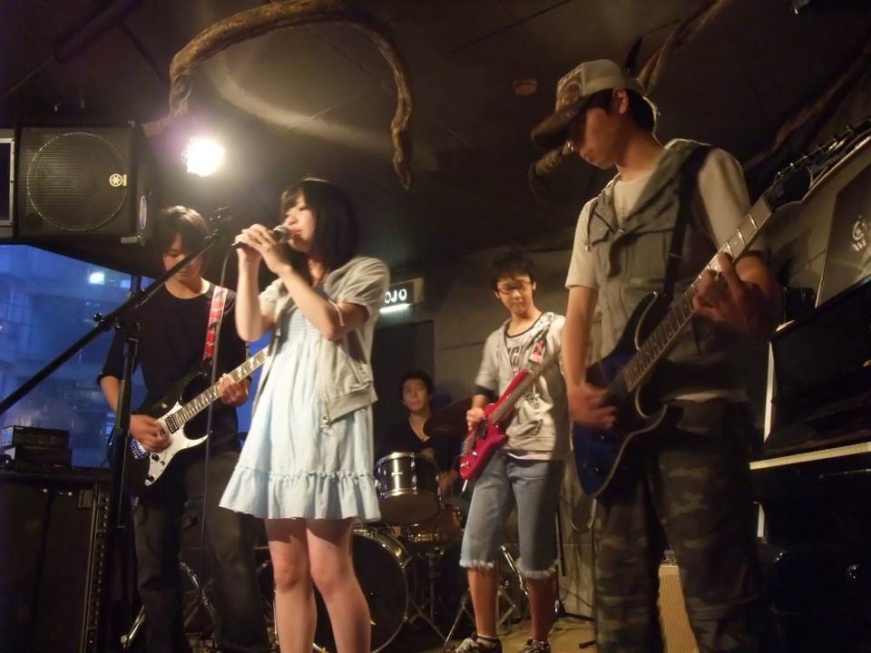 このバンド、La Miel(ラ・ミエル)と言い(フランス語でハチミツの意味ですな)、メンバー構成は上の写真通りな感じですが、若い高校生の息吹を感じさせた2曲(カバー曲ですが)を聴かせて頂きました。しかし、メンバーの中には、まだ楽器を初めて3ヶ月くらいしか経っていない人もいるらしく、それにしては随分とまとまりがあったと思いましたね。もちろん、それぞれのパートで一杯一杯の様子ではあり、もっとバンドらしくすべき部分は、言えば沢山出てきてしまいますが、まずは1ステージやり切った!…というのが、何より素晴らしかった事ではないでしょうか。そして、ミキヤが予想以上に大人らしくなっていて、何だか感心してしまいました。まあ、ミキヤはこういった場所に昔から出入りしているので(笑)、慣れている部分もあるとは思うのですが、そういった今までの活動が、今回正に生かされていた感じですね。このバンドが終わった後の、伊藤さんの安堵の顔(左下写真参照)といったらありませんでした(笑)。また出演してほしいものですね。