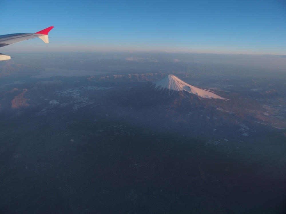 羽田空港からの離陸なので、出発してからは日本の国内線を飛んでいるかのようです。お馴染みの風景が続くとなると、やはり富士山は期待せざるを得ませんが、この時自分は右の窓側席に座っていて、素晴らしく美しい早朝の富士山を拝む事が出来ました。丁度、日の出の時刻とも重なっていた事もあって、よく済んだ空の下には、太陽に照らされて少し赤色に見えたのが印象的でした。恐らく自分の人生の中で、今までで一番綺麗に見えた富士山かもしれません。香港行きの飛行機から見えたというのが何だか愉快ですが(この時の機内は、それは活気に満ちておりました…笑)、バタバタの中で出発をしていった自分にとって、少し元気を貰えたような時間でもありました。