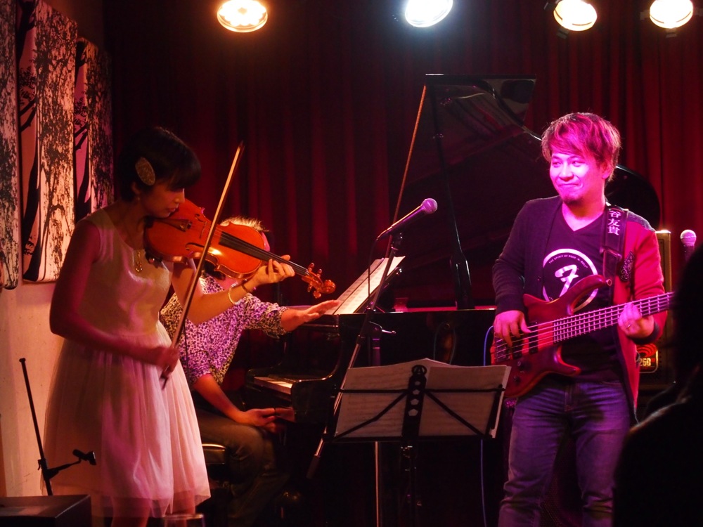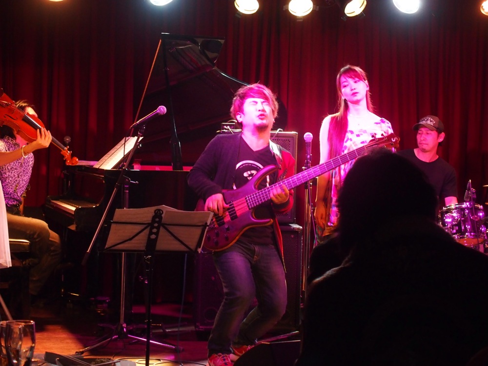 そして黒船のステージです。この日のステージ時間は1時間強というものでしたが、敢えて曲数は少なめに設定し、ジャズのフォーマットである事を生かし、それぞれの楽器のソロを長めにしたステージを展開させていきました。曲は勿論 2nd.CDアルバム『BREAKTHROUGH』からが基本ですが、それ以外にも、久し振りにジャズスタンダード曲である“My Favorite Things”を演奏し、その中で津軽三味線のじょんがらを披露していく等、個々の楽器をフィーチャーさせた時間も忘れずに進めていきました。その時間は非常にパワフルで、ジャズというかロックに近いのでは…と関谷君も思う程でした(笑)。確かに、津軽三味線のパワーにはロックの精神を感じさせてくれるのもあり、これからはロック魂も忘れずに?ライブに向かっていきたいとも思ったものです。