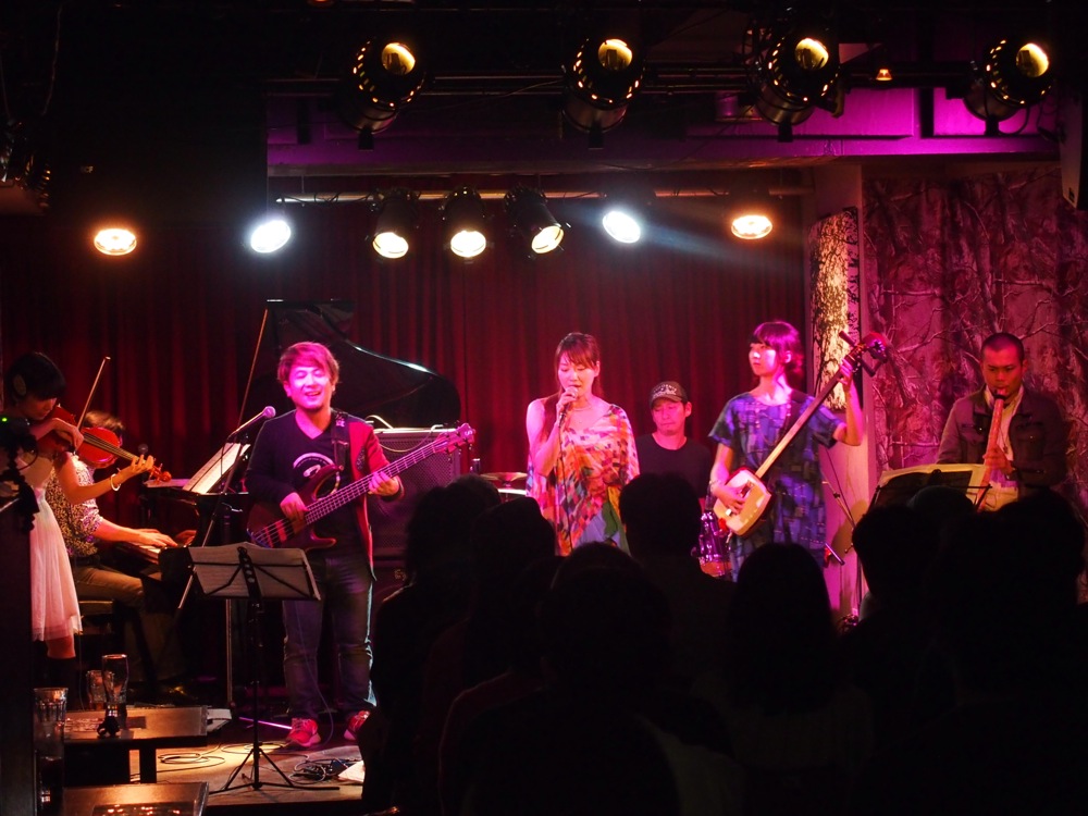 …との事です。御存知の通り黒船というバンドは、北の津軽三味線と南の奄美島唄をジャズのフォーマットで表現するバンドで、これだけで既に特徴的なのですが、こうしたバンドを集めてイベントを行うというのは大事で、フィールドは違えど、バンドによっての個性は自分達に刺激を与えてくれる事は間違い無しで、演奏者としても興味があるところでした。勿論、お客さんの興味も一気に惹き付けたようで、当日は満員御礼で迎えさせて頂きました。