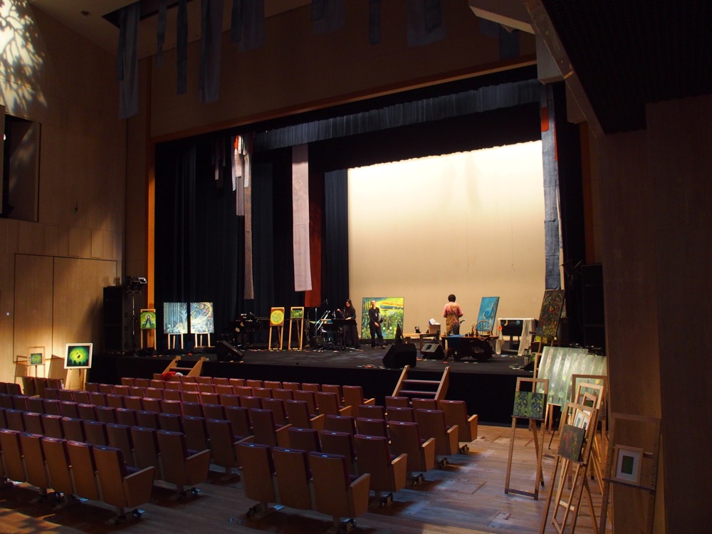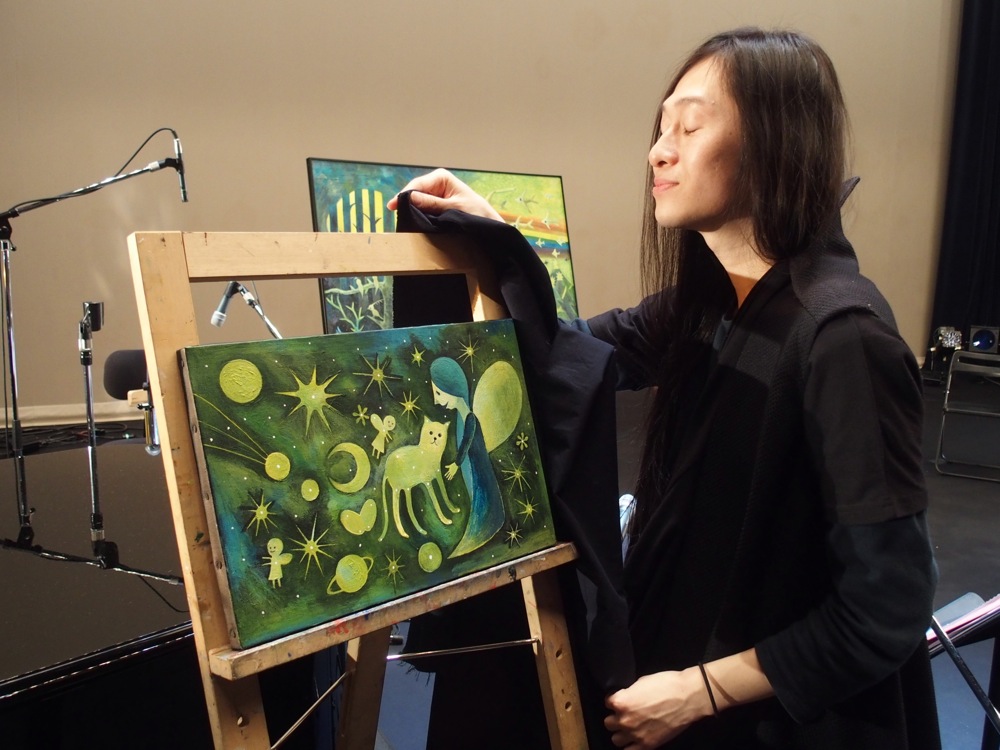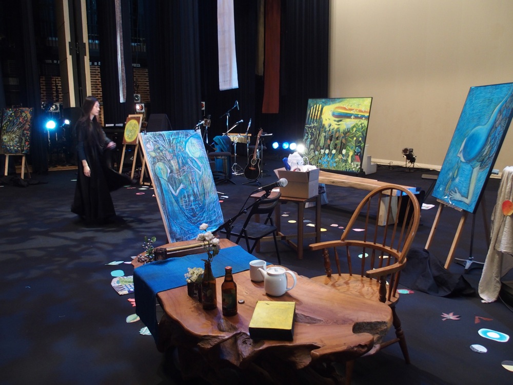 ステージ内…というか、ホール内に入った瞬間からアートとのコラボは始まっており、画家の田川誠さんの作品がズラリと並べてあり、ここから既に物語の世界に足を踏み込んでいる事が分かります(尚、右上写真のステージ上に並べられてある複数の絵画ですが、最初は黒い布で覆われています)。そして、その世界に音楽と朗読という要素が加わって、本番が始まっていくのでした。この“音楽”というのも、ただライブをするというものではなく、飾られている絵画との関連性をうまく繋ぎながら、全ての曲、動作の時間に意味を持たせて進めていくという、物語自体にも全力で注いでいかないと置いていかれそうな内容のものではありました。