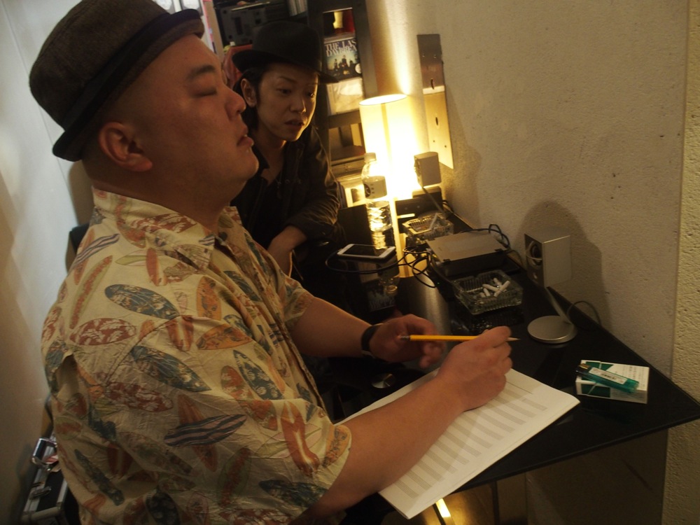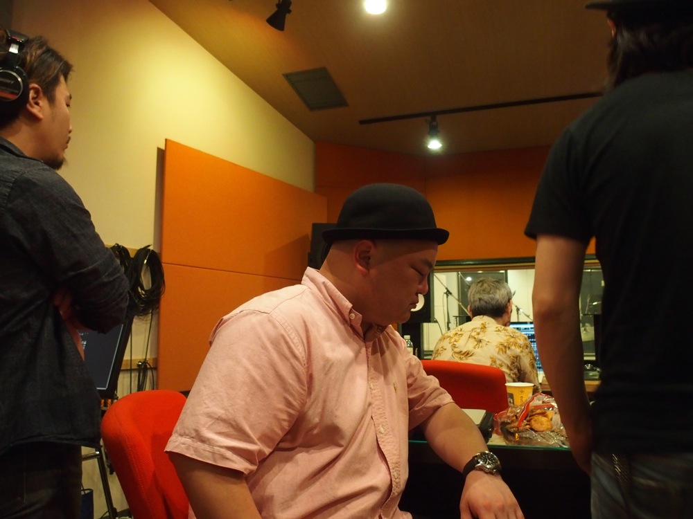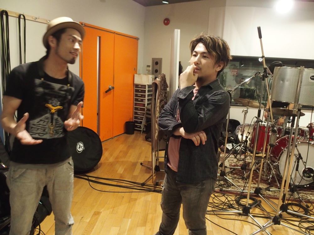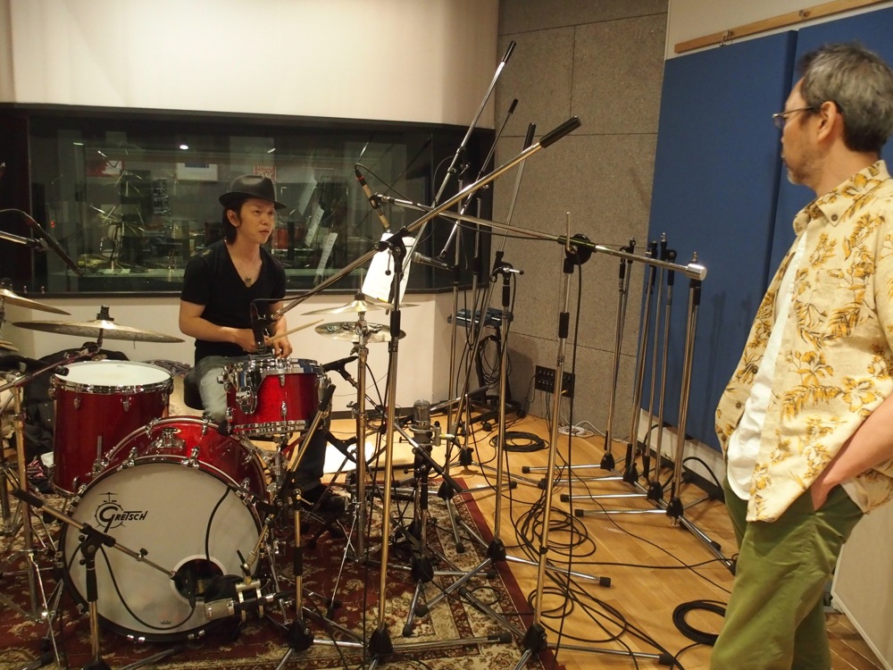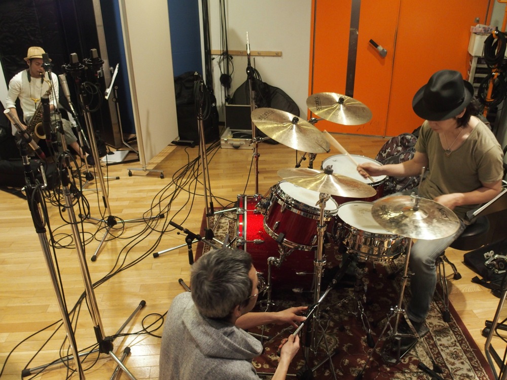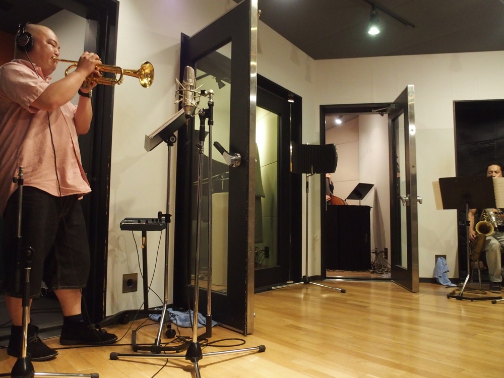 勢いを追求するあまり、トランペットやサックスは通常ブースに入っているのですが、ある時から出てきて(右上写真参照)ドラムと同じ部屋で録るようになりました。敢えて音を被らせていく事により、ライブ感ならではの勢いのあるサウンドを作り出していくのです(その分、演奏者への負担は大きいものになりますが…)。