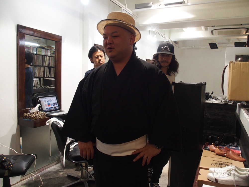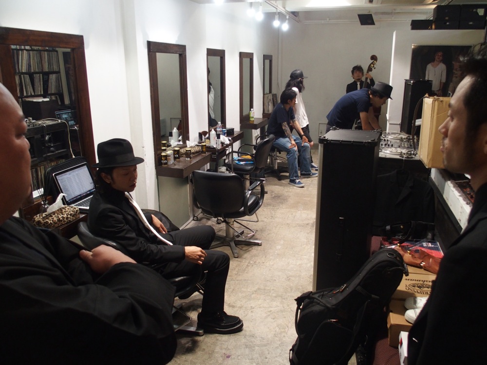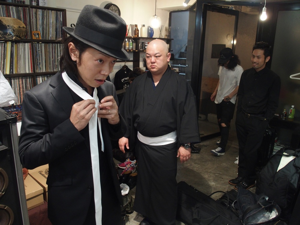今回は全員(1人を除く…笑)、黒スーツ、黒パンツ、黒シャツ、白ネクタイという、かなりの統一感で臨んでみました。今までのパターンからすると、ここまで統一させているというのは珍しいやり方だと思ったのですが、メンバー全員で並んでみると、これがまた壮観で、1つの自分達のブランドを確立出来たような感じがしました。トランペットの織田君も、着物ではありますが、黒一色の着物に、帯は白で合わせ、ここにも統一感を出していきました。これは楽しみではありませんか。