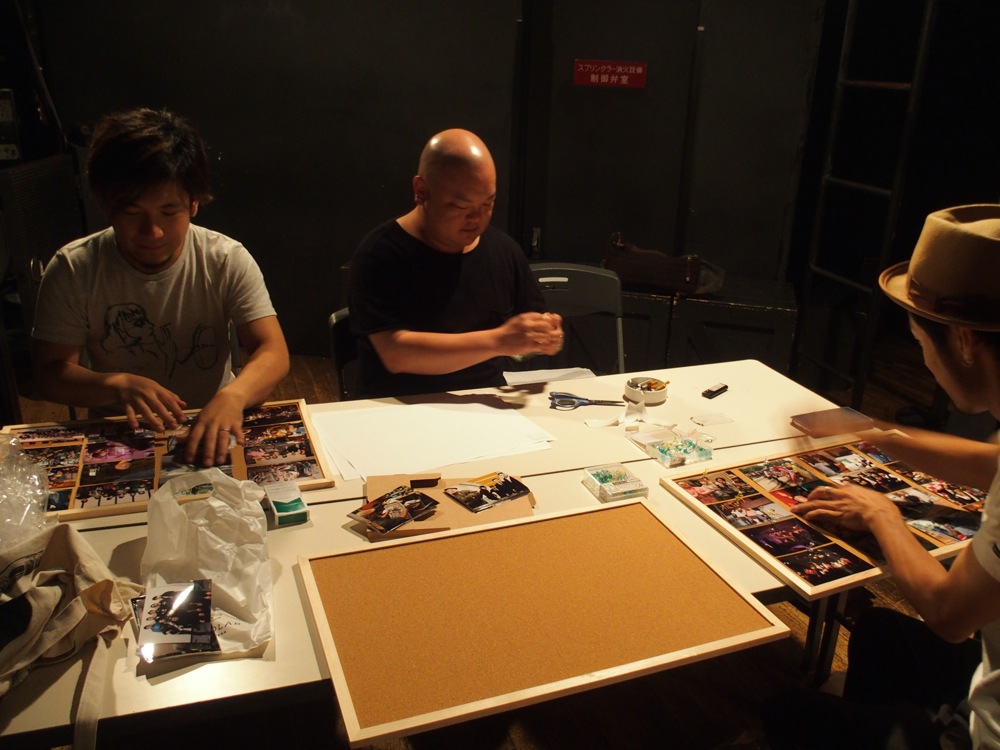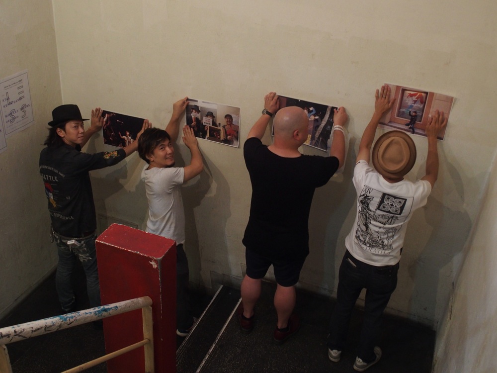 当日、メンバーは、当初の入り時間よりも1〜2時間早くはお店に入っていました。10周年という事で、この日ならではの作業を色々と準備していた為です。それは、バンドの10年間の歴史を写真で辿る…というもので、お店のエントランスから会場に至るまでの階段の壁に、昔からの写真を時系列的に貼り、そして会場内では、コルクボードに一面に貼られた、昔から現在に至るまでの厳選された写真100枚を展示させて頂いたのでした。