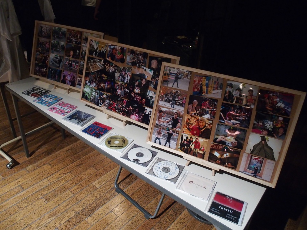 そして、そんな我々を祝福してくれるかのように、今回は沢山のお花を頂きました。これらは会場にも飾られていて、自分達のCDと共に、華やかに場を飾ってくれる事になりました。皆様本当にありがとうございます。また、TRI4TH Tシャツも今回から新しいデザインの物が出来まして、物販も賑やかな事になっていました。それらに混ざって並べていたのが、先程の写真達でもあったのです。また、写真の時代と並行させて、当時作っていたCDも置いてみたのですが、初期の頃は自主制作という事もあり、かなり貴重なCDもありましたね(自分も今回初めて見たのが多数…笑)。このエリアだけで長い時間を過ごせそうな感じでしたが、DJが始まり、いよいよライブオープンの運びとなったのでした。