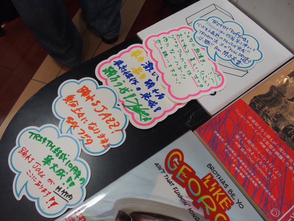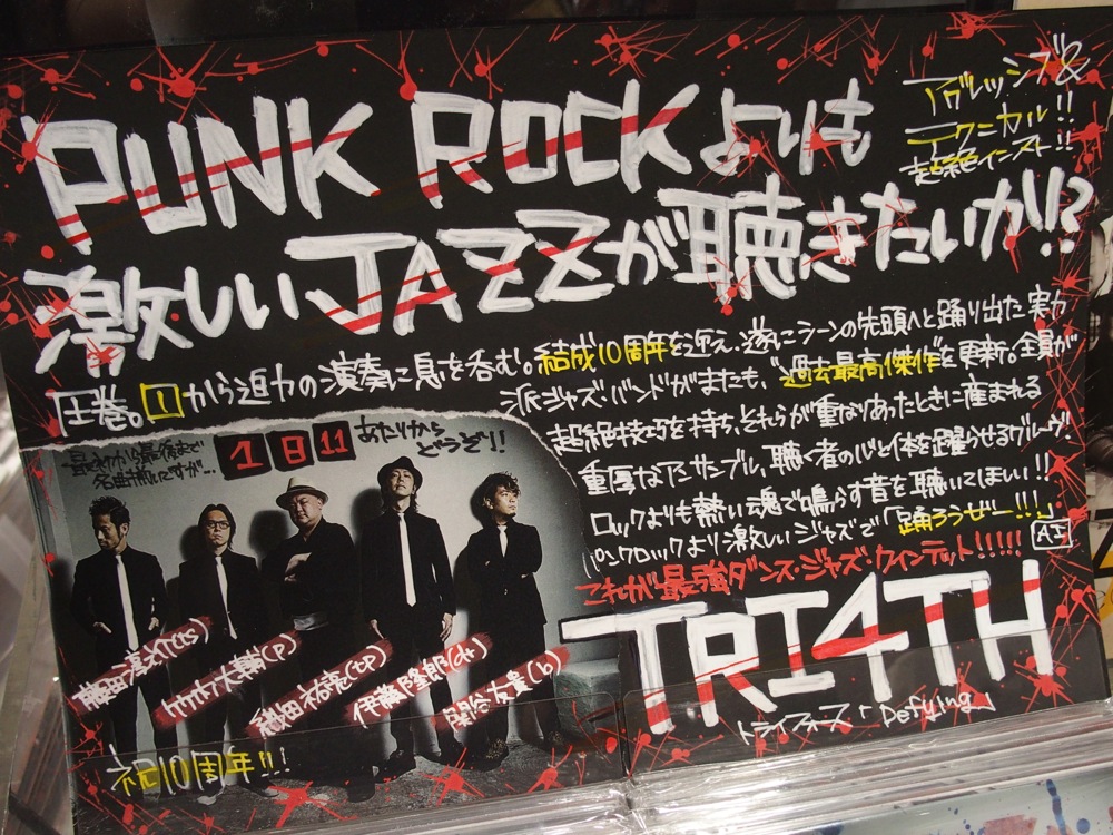…以上、計7店舗でした!…なかなか痺れますが(笑)、お店に置いてあるCD達を見ると、まだまだ自分達も頑張らねばと思いますね。そんな中、お店にある各ポップを見るのも楽しく、やはりここはお馴染みのタワーレコード渋谷店のポップを取り上げたいものです。今回はかなり目立ちます。「PUNK ROCK よりも激しい JAZZ が聴きたいか!?」…聴きたいでしょ!!…皆様、引き続きどうぞよろしくお願いします。