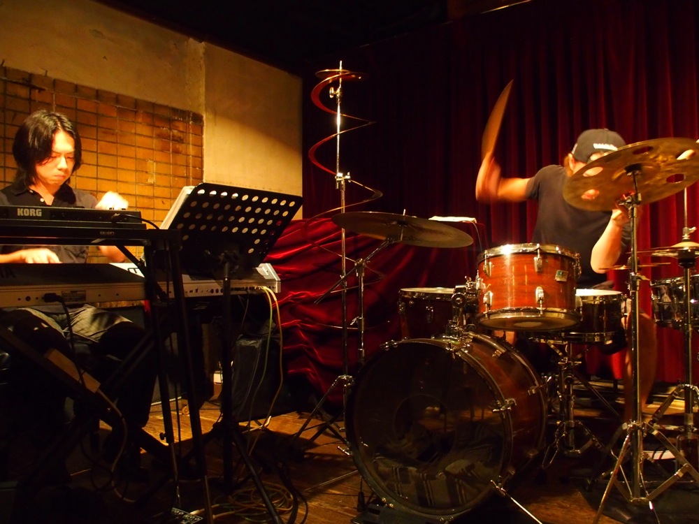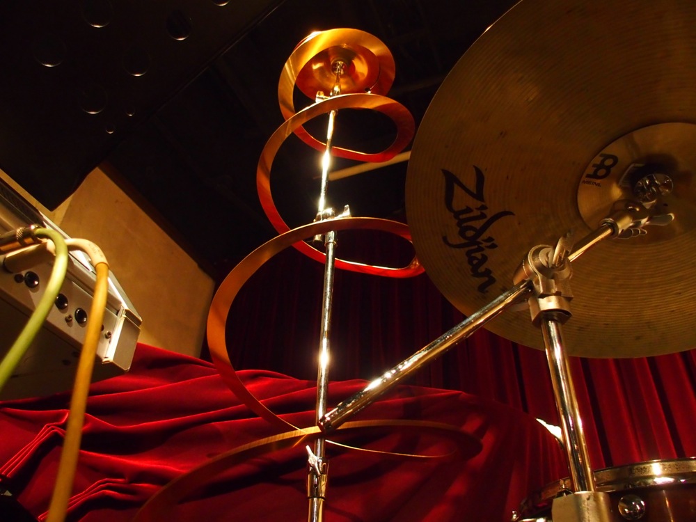 今回のドラムセッティングに新しく登場したスパイラル・トラッシュ。音も個性的(どちらかと言うと、見た目のインパクトが勝る印象ですが…笑)で、自分達の音楽に合いそうなシンバルでもありましょう。更にモチベーションが上がりつつ、お馴染み、全編ノンストップのライブが始まっていくのです。