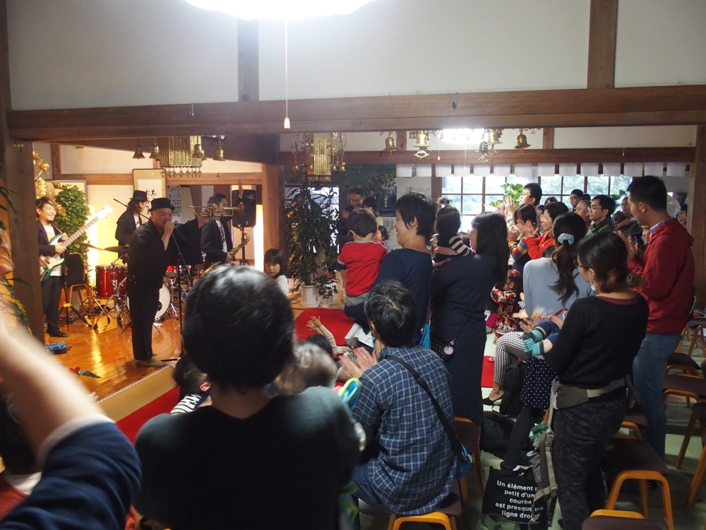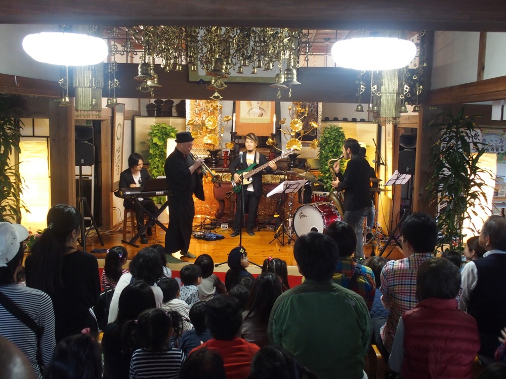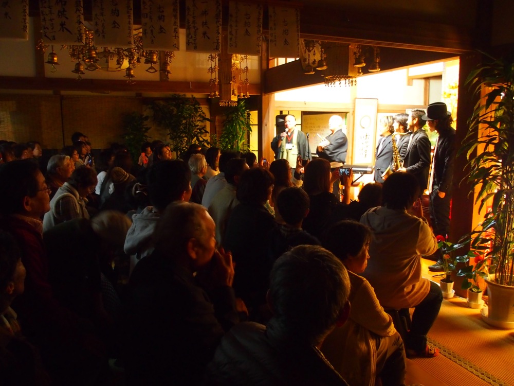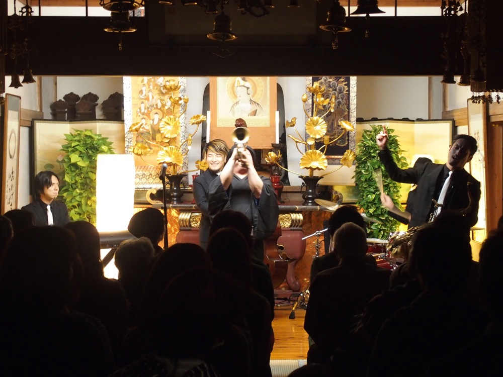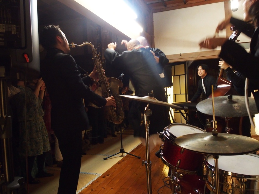 お寺の形式に則り、大きな鐘、そして小さな鐘を鳴らしてからの、我々の入場となりました。そして重厚なサウンドを鳴らしてから、“SNAKE”へと繋がらせてライブの幕開けとさせて頂きました。もうその時点からお客さんもノリノリです。その後、“Hop!”、“Moanin'”と、身体を動かしやすい曲を続けて演奏していきましたが、ふと見ると、住職もノリノリで聴いて頂いているではありませんか。しかも腕を振り上げ、かなりダンサブルな楽しみ方をしています(笑)。何とも嬉しい瞬間で、演奏している自分達も更に熱量を上げていった事でしょう。