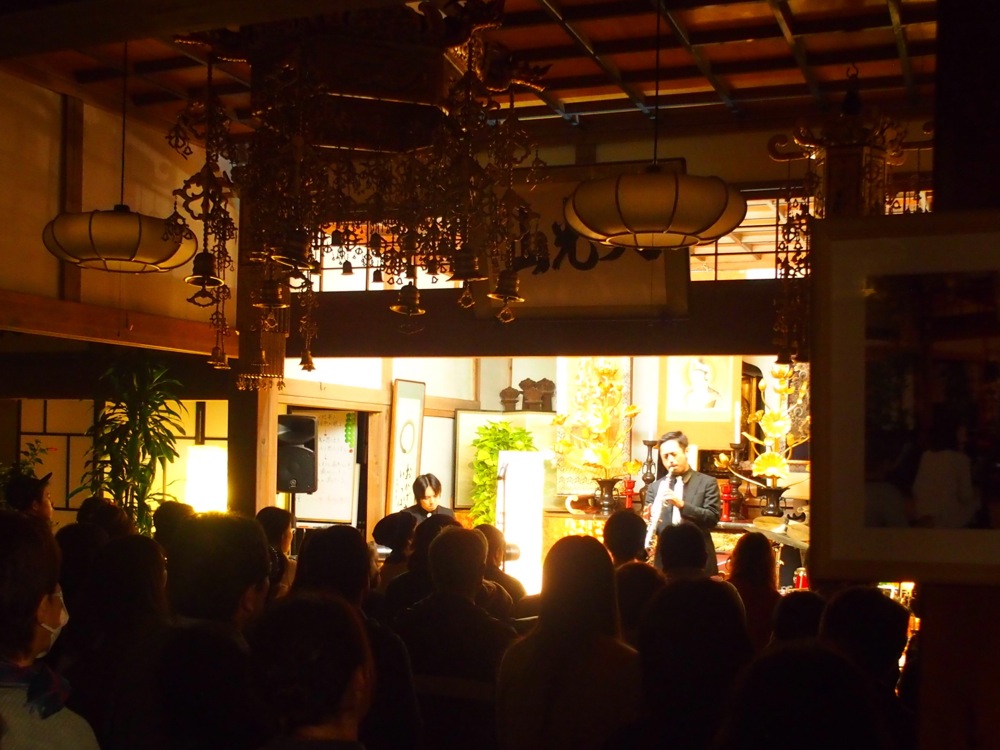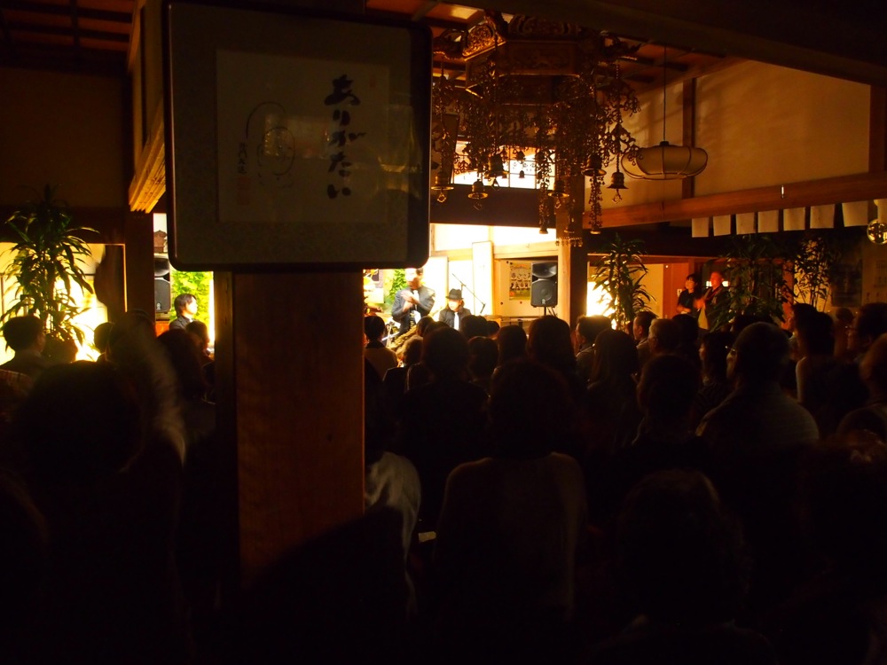そうして夜の部『寺ごころ』に突入です。時刻は17:00からとなっていましたが、辺りは既に薄暗くなっており、本堂内は『わらべ JAZZ』の時とはかなり異なる雰囲気になっていました。ここからは、普段の TRI4TH のライブをそのままお届けしていく時間になるわけで、より気合いも入れていきます。お客さんの数も、130人を越える人数にまでなっていたそうです。これは腕が鳴るというものです。
