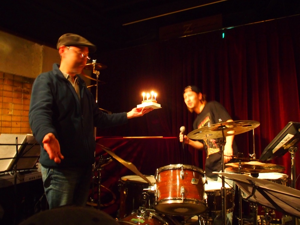 …さて、そんなこんなで駆け抜けた全2セットでしたが、ステージ直後にサプライズで、自分は“Happy Birthday”を弾き始めます。…そう、このライブの前日の日は、リーダーの38歳の誕生日。せっかくなのでケーキとワイン(メッセージ付き)を用意し、ステージ上でお渡ししたのでした。リーダー的に、こういった演出が好きではないのは十分承知していますが(笑)、まあライブ直後という事で、ステージ演奏中には絡ませなかったので許してくれるでしょう。どうもおめでとうございました!