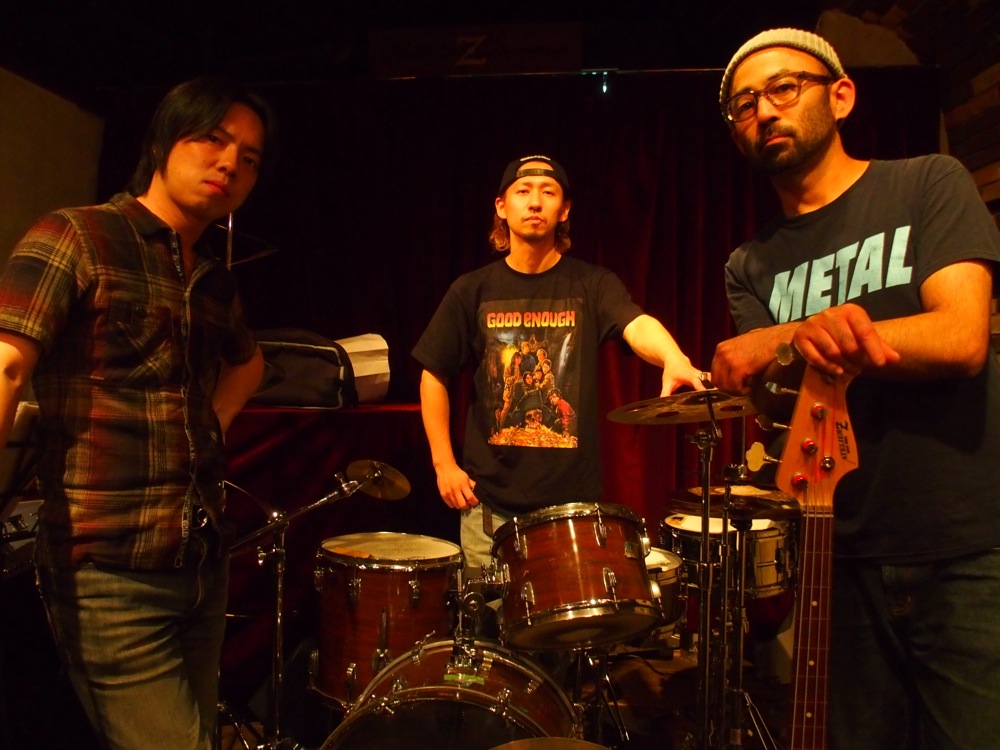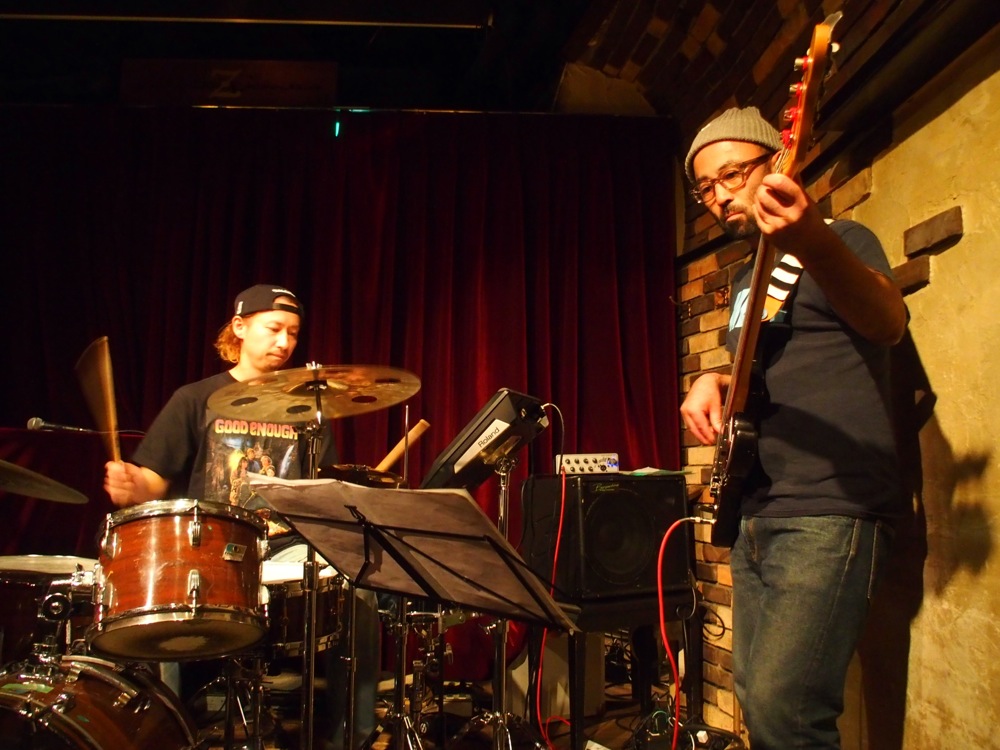 最近、ドラム機材が特に増えているという(笑)リーダーのドラムの佐々木俊之さん。前回のライブ〔Nautilus、3rd. 7インチアナログ、リリース記念ライブ!参照〕で初お目見えをさせたスパイラル・トラッシュ越しに見えるのは、今回のライブで初導入をさせた、電子ドラムパッド(左上写真参照)です。ここに予めクラップやシンセ等の音源を入れておき、演奏中にドラムと共に、時にリズミカルに、時に効果音として鳴らさせるのです。…また新たなアプローチが出来た Nautilus の世界観。実際に生のライブで見るからこそ、その威力に驚く事でしょう。