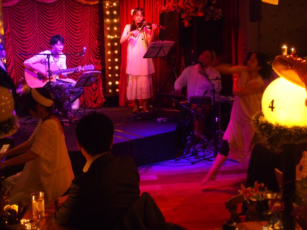 続いて、Moon Ring。ピアノのくぼなつみさん率いるこのグループは、ギターはバイオリンに加えて、パーカッションやダンサーの方もいて、アイリッシュや、民族音楽的な要素を感じさせる音楽を作り出していました。また、今回の空間の中にダンサーの方がいるという風景がなかなか合っていて、それがまたオリジナルの世界観を作り出している印象が面白かったです。