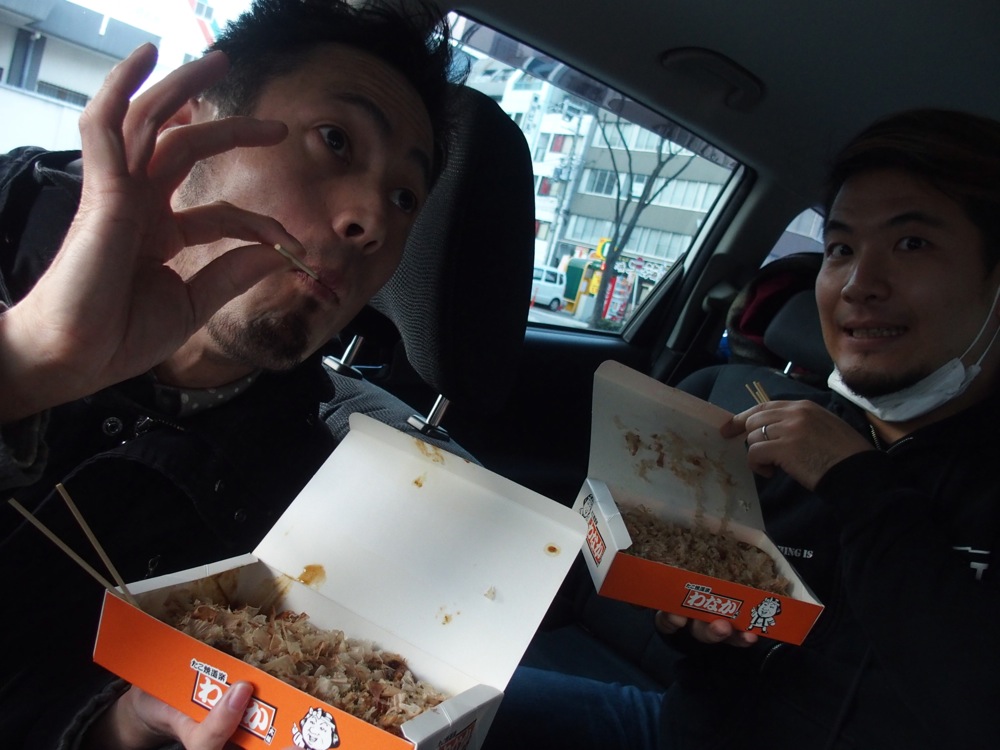 そうして約6時間かけて大阪に到着。この時点でライブの入り時間まで少し間があったので、地元でも有名な、たこ焼きの『わなか』で腹ごしらえをしておきました。粉もの好きな藤田君。これで一気に体力も回復どころか、より高いテンションを維持出来そうです。