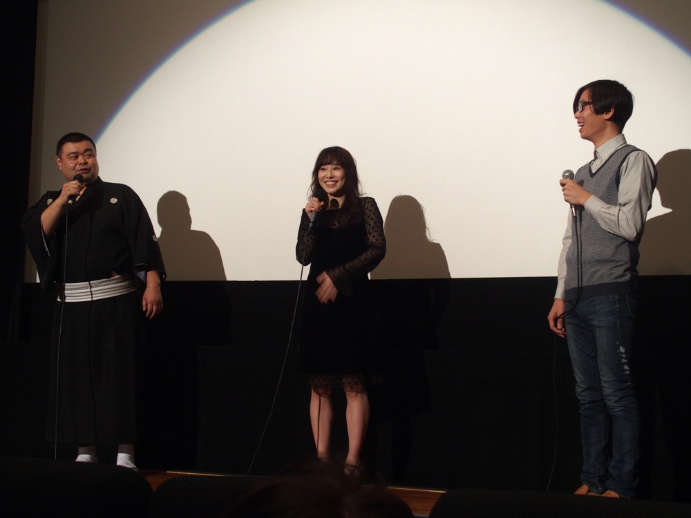 ケイズシネマはビルの3階にあり、エレベーターに乗ってフロアに到着すると、突然、主演の友部康志さんが出迎えてくれるではありませんか。先日、『ねぼけフェス』に TRI4TH が出演させて頂いた〔TRI4TH、『ねぼけフェス』に出演!参照〕縁で、お互いに顔が分かっていたので、出会い頭でお互いにビックリするという状況が生まれていましたが(笑)、お越し下さったお客さん全てに行っているそうで、流石だと思いました。なんと、この日は偶然、壱岐監督や出演陣(友部康志さん、大竹佳那さん)の舞台挨拶が用意されているとの事で、それも楽しみつつ映画鑑賞させて頂いたのでした。