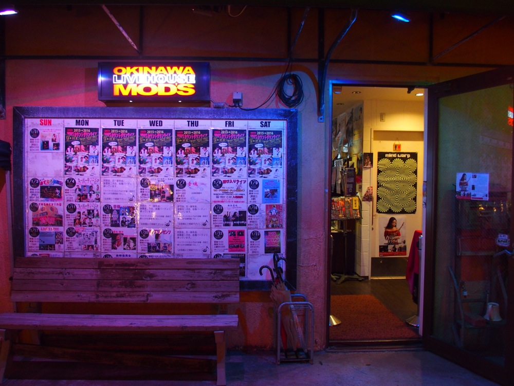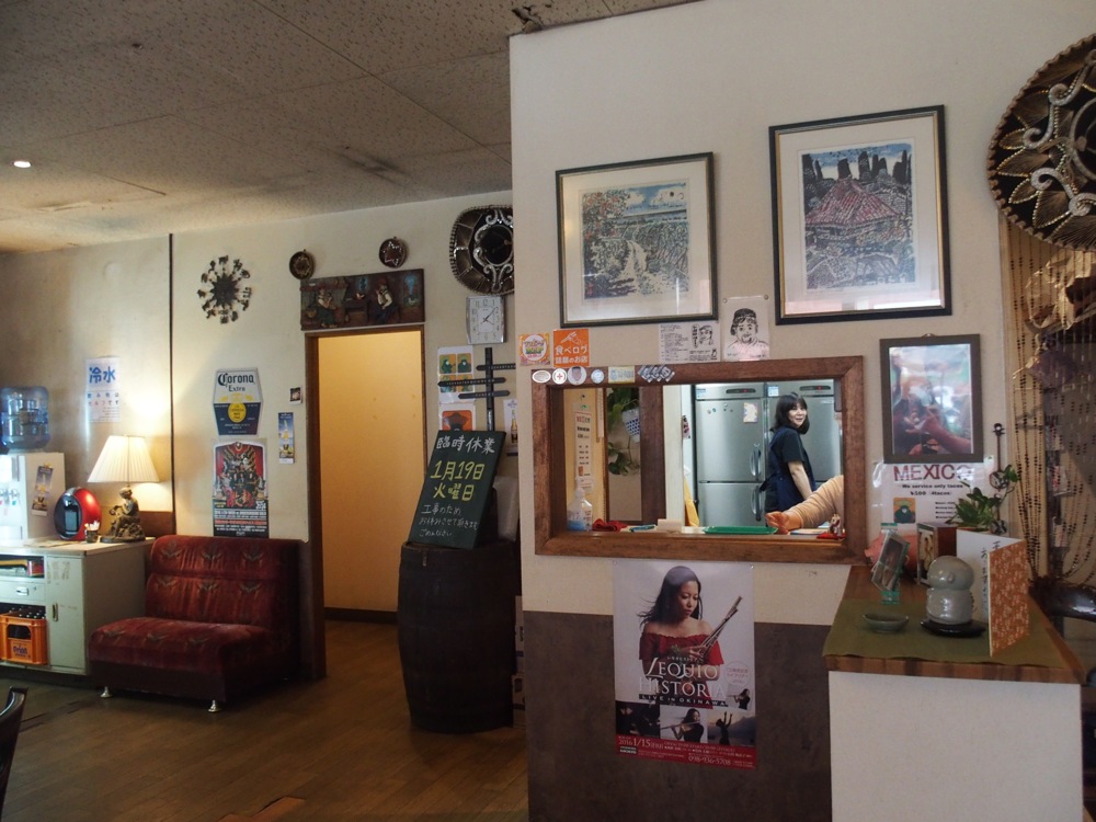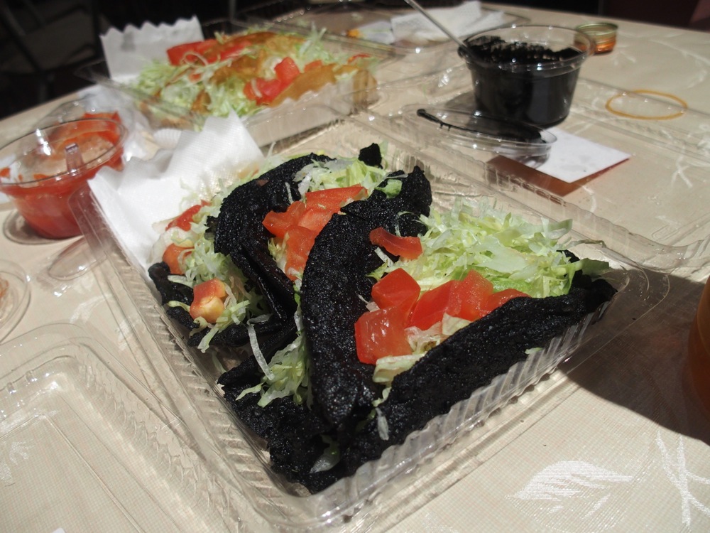空港に着いてから、直ぐさま車で北谷へと向かいます。1日目のライブ場所である Mod's に向かう為ですが、途中にはお馴染みのタコス屋であるメキシコにも寄っておきます。時間があまり無かったので、持ち帰りだけにする筈だったのですが、せっかくなので店内でも食べてしまいました(笑)。そんな店内を見渡してみると、この日行われるライブのポスターが貼ってあるではありませんか。多くの方の協力を経てこのツアーが成り立っている事を実感…。身が引き締まる想いと共に、ライブを楽しもうと改めて誓ったのでした。Mod's に持っていって食べたイカスミのタコスも、これまた良いパンチ力を持っていました(笑)。