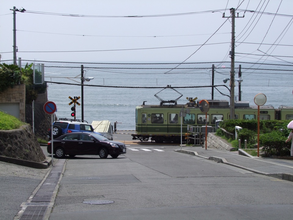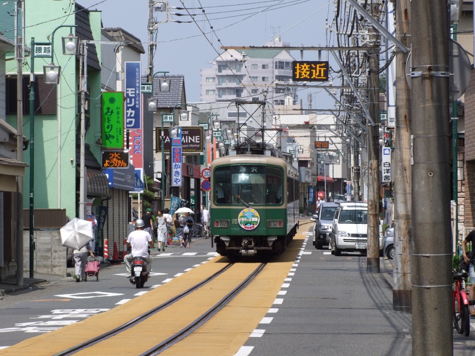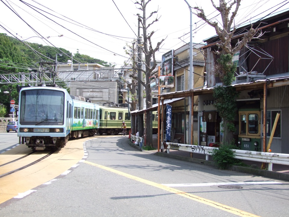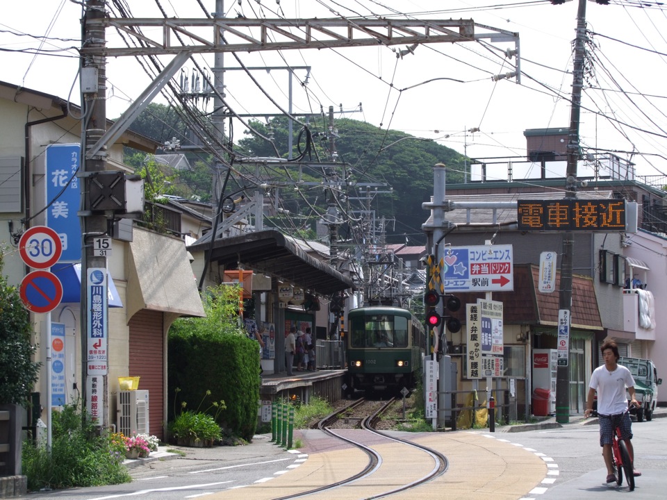 この駅から次の腰越駅までが面白いです。路線は道路との併用区間に入り、さながら路面電車のような風景が展開されるのです!…更に言えば、1両が基本の路面電車と比べると、こちらは最大4両編成ですから、いくら小型車と言えど迫力が違うわけです。また、この道路があまり広くない(商店街ですからね…笑)という事もあって、ますますスリル感が倍増されているように見えます。よく車に当たらないものだと感心してしまいますね…(笑)。