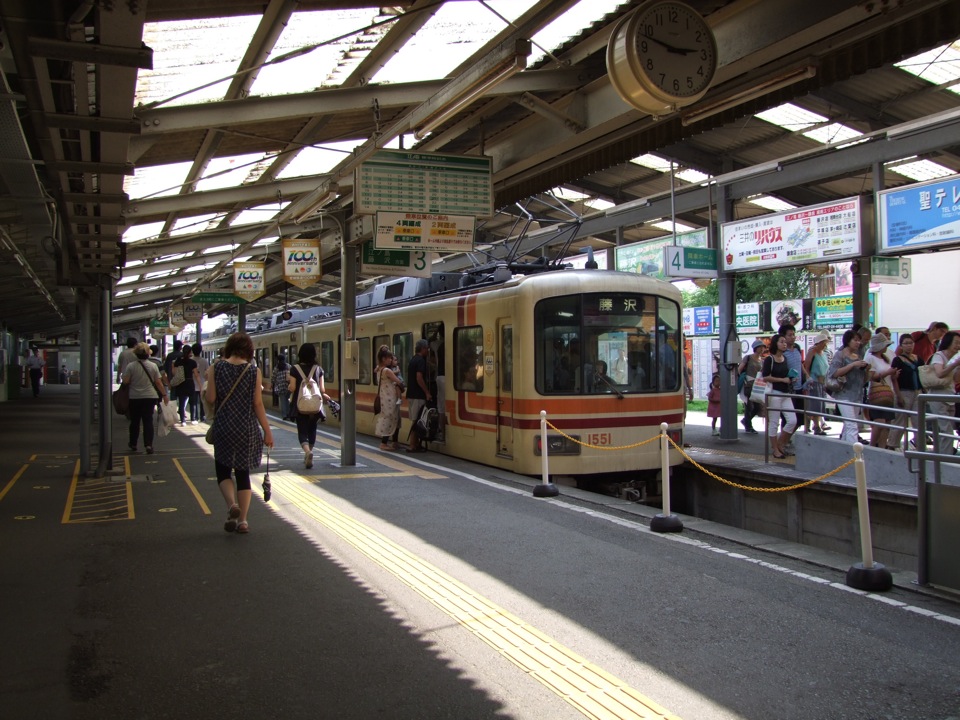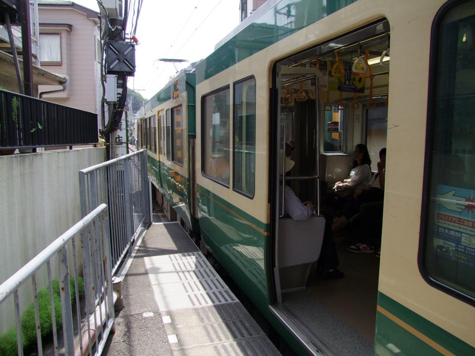 江ノ電の時刻表は、実にシンプルです。それは早朝・深夜を除き常に12分間隔で、藤沢駅発の時刻を見ると、毎時00、12、24、36、48分発となっています。これなら時刻表もいらないくらいでしょう。…逆に、これ以上の増発は出来ません。全線単線で、列車同士が行き違い出来る駅も限られ、しかも現在それらはフル活用しているからです。列車は2両編成を基本とした車両を繋ぎ、4両編成で走っている事が多いですが、元々が小型車でもある為、よく混んでいるようなイメージがあります。まあ、基本的に自分が江ノ電に乗る時期というのは夏が多く、しかも観光客がよく利用する時間帯に限られる為、たまたまそうなのかもしれませんが、江ノ電は都心から1時間で来れるような場所でもある為、こういった方達にもよく利用されているのは事実です。この日も例外ではなく、藤沢駅発車の時点で、かなりの立ち客が目立つ感じになっていました。