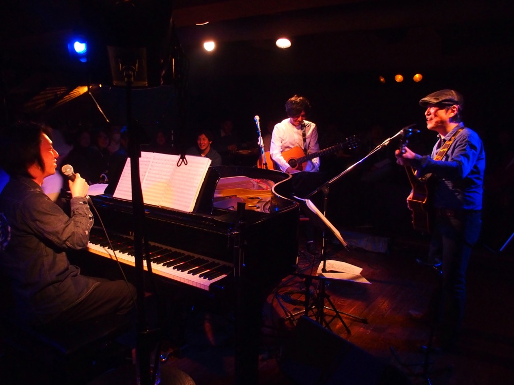 まず、お店に入って驚かれたと思うのは、いつもはステージ上にあるグランドピアノが、今回は客席の真ん中に鎮座しているという事でしょう。いつもよりグッと近くに見えるそのピアノの姿は、一瞬アンバランスにも見えますが、とても身近な存在に思えてくる印象も芽生えて来たと思います。そして、そのピアノと向かいあうようにボーカルマイクが設置され、出演者3人で向かい合うようにステージはセッティングされているのだと気付きます。そして客席は、更にそのステージを囲むかの用に配置されており、座席は従来のステージ上にまで及んでいました。