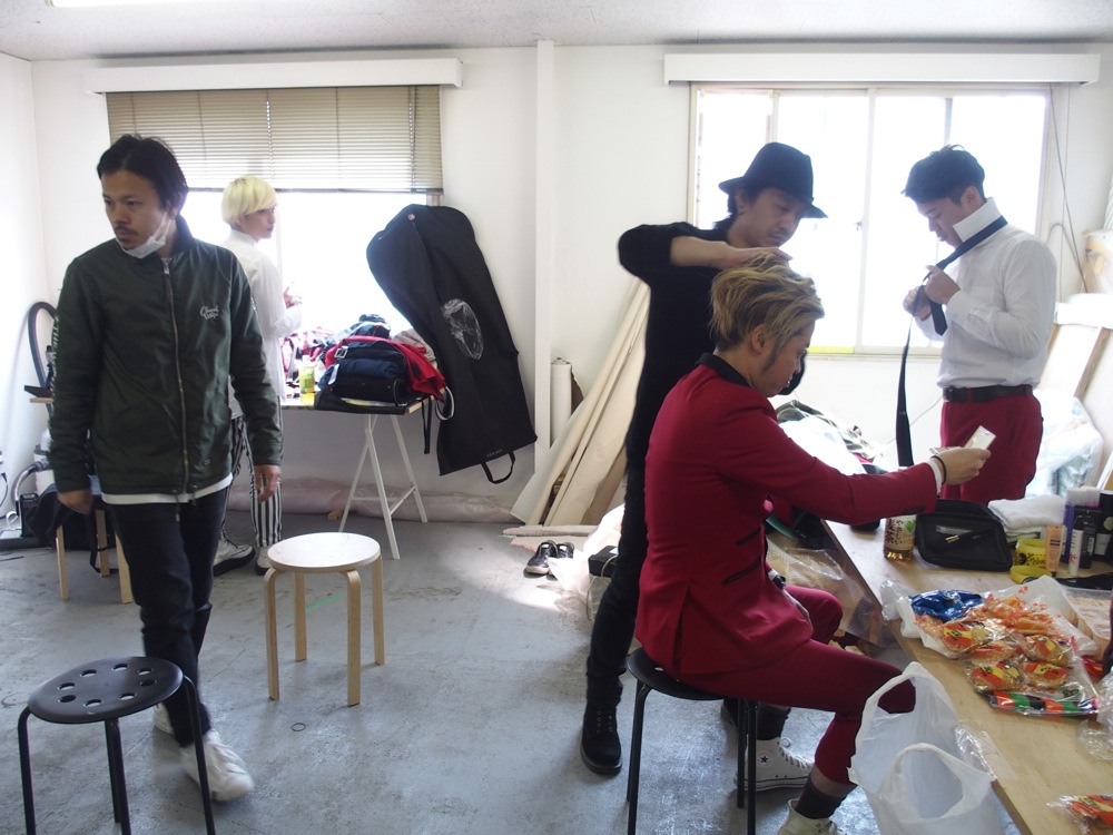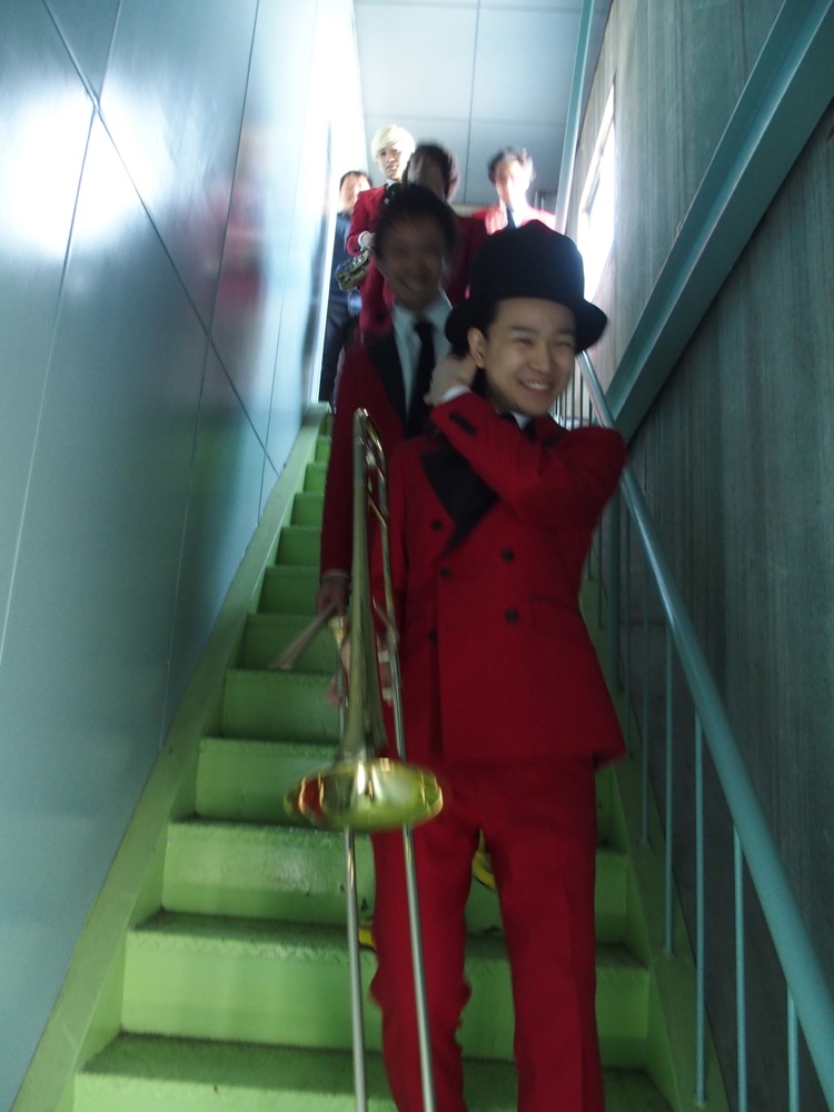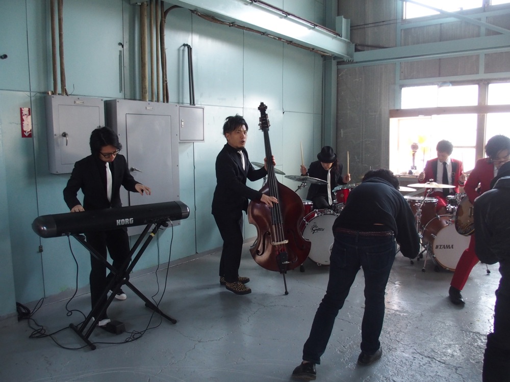 スタッフやお互いのバンドメンバーの車でひしめき合う、現場の駐車スペースは、さながら倉庫番を彷彿とさせるような光景になっていましたが(笑)、それだけ、今回のMVに関わる人が多いという証拠でもありましょう。早速衣装合わせをしつつ、トランペット織田君の右上写真の帽子は不採用になってしまいました。…残念(笑)。